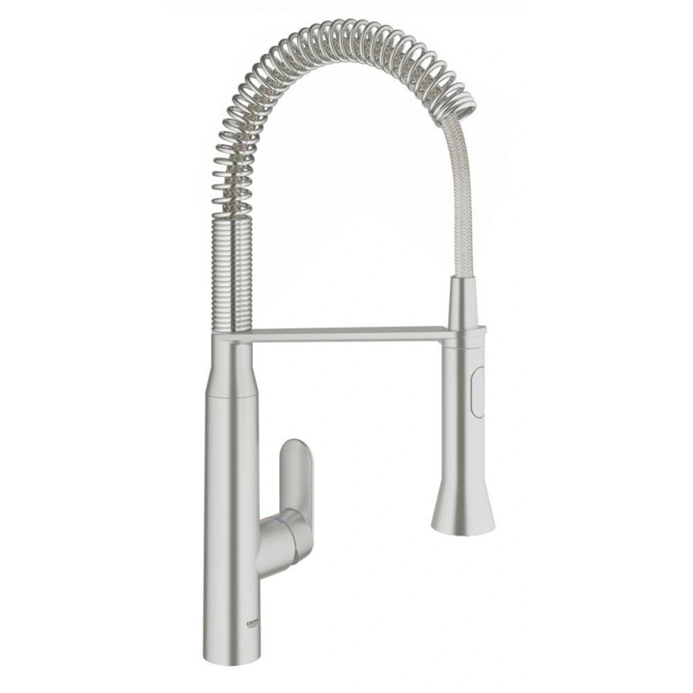 The single-lever sink mixer K7® with pull-out SpeedClean professional spray head is equipped with a GROHE 35 mm SilkMove® ceramic cartridge for the continuous adjustment of temperature and water volume. This can be set by the variable flow limiter. The medium-high spout has a swivel range of 140° and the professional metal spray head with automatic reset from SpeedClean to mousseur has a swivel range of 360°. The faucet is protected against backflow.