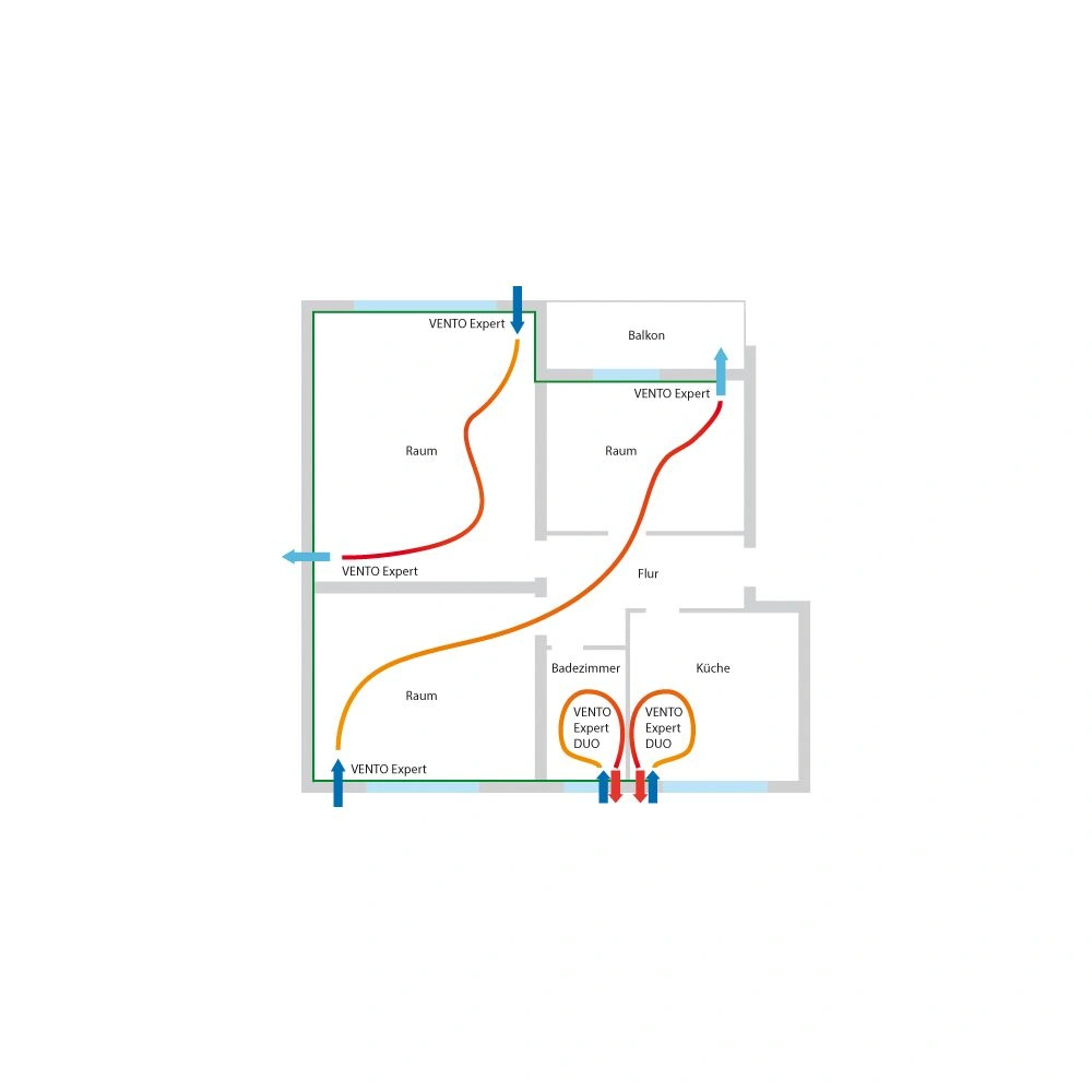 All product information Scope of deliveryBlauberg single-room air-handling units are an efficient solution for supply and exhaust ventilation of flats, houses as well as industrial buildings. Heat losses caused by ventilation are reduced by heat recovery. Humidity balance and regulated air exchange create an individually controlled micro climate. VENTO Expert DUO A30 can be either operated as an independent unit or it can be wired to other units in a house. The ventilation system is equipped with a humidity sensor for indoor humidity control. As soon as air humidity rises higher than the set point, the system will automatically boost to high speed.