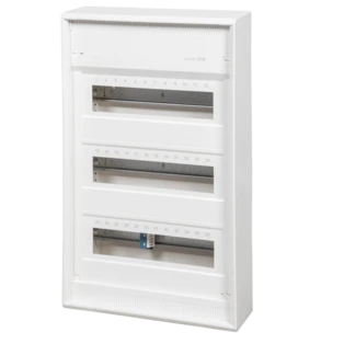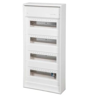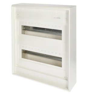 The small surface-mounted distribution boards are suitable for the use in residential buildings. Devices of up to 63 A / 400 V with an installation depth of 70 mm can be inserted in their distribution rows. The plastic wall boxes have a cable strain relief bar as standard and knock-out cable entry sliders with snap-on fastening. The frames with 15 mm plaster compensation provide a flush wall connection after the mounting. The finger-safe QuickConnect terminal with plug-in technique in assembly-friendly snap-on technique and terminals for GFCIs ensure simple wiring. The integrated spirit level makes wall mounting an easy task.