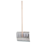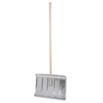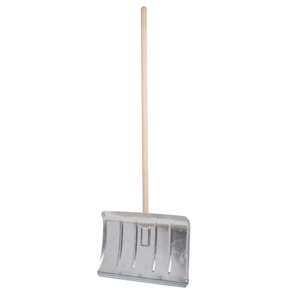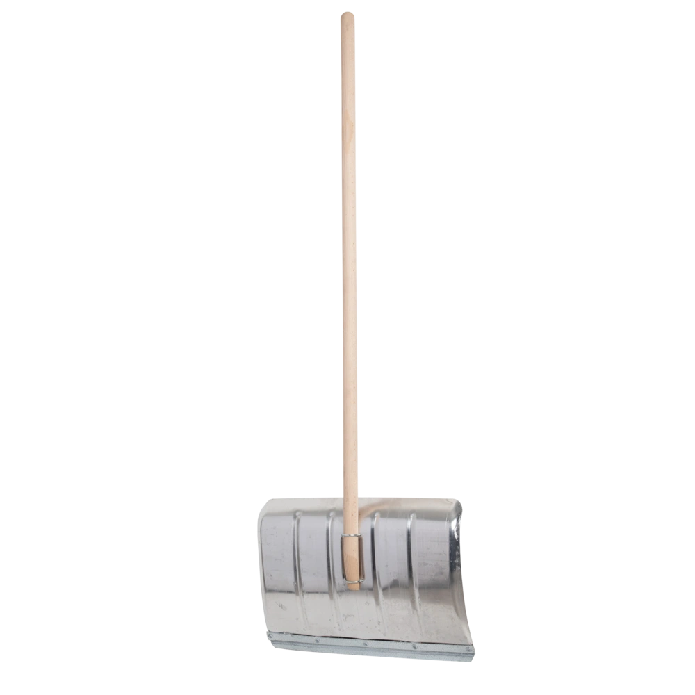 Snow shovel made of light metal with a protective edge and a long beech handle for removing snow and ice.