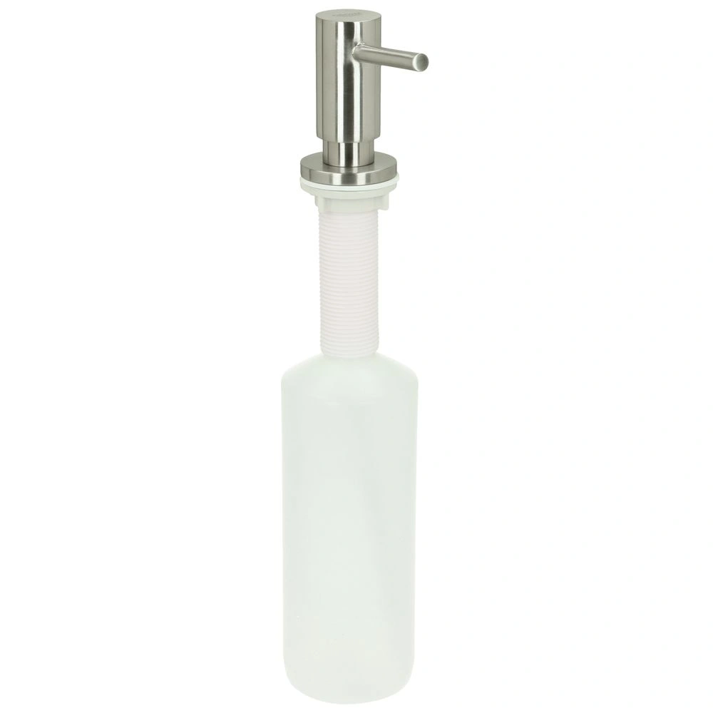 The GROHE soap dispenser Cosmopolitan has been designed for monobloc installation. Above the max. 60 mm thick worktop, there is the dispenser with the easy-to-clean and scratch-resistant finish and below there is the container for cleaning agent or liquid soap..