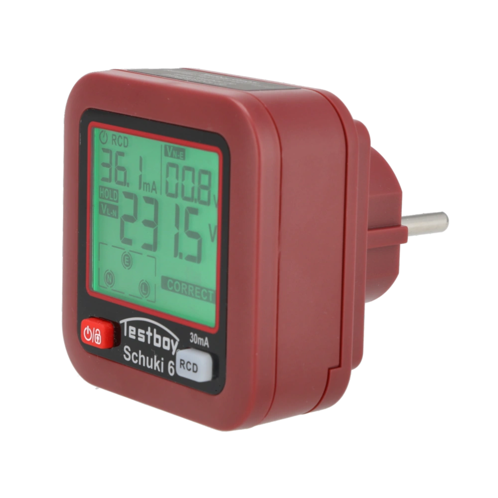 Le Testboy Schuki 6 est adapté aux prises de courant avec contact de protection conformes à la norme européenne de type F ou combinées de type E/F. Vous trouverez également le mode d'emploi en français dans la rubrique de téléchargement. Le conducteur de terre doit impérativement être branché à la prise de courant. ​