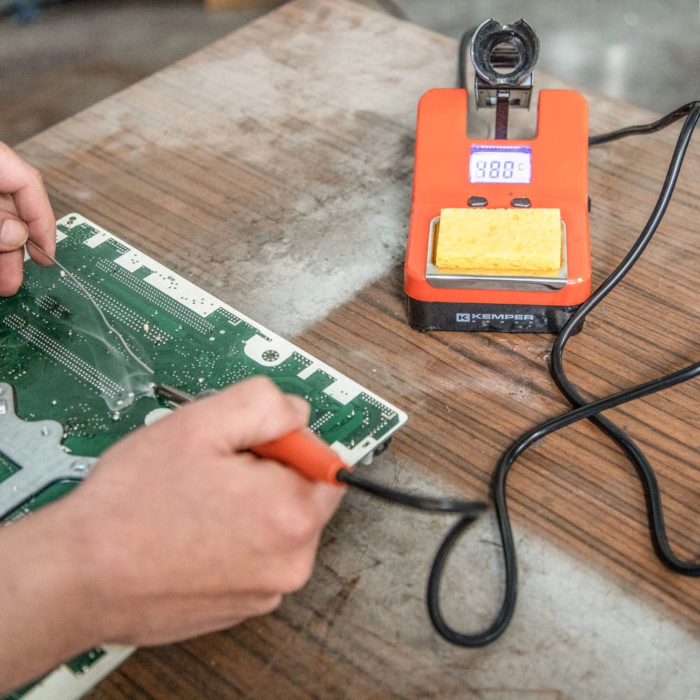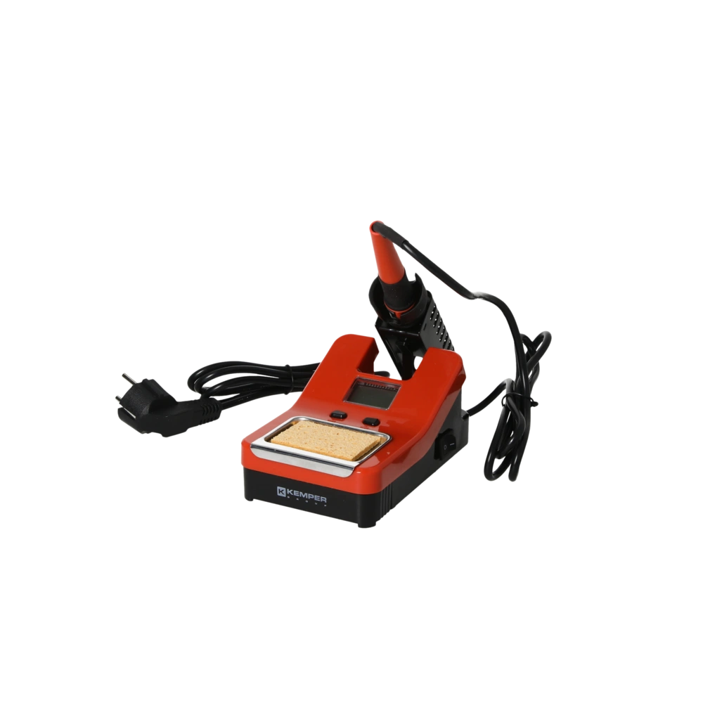 Soldering station for working on electronic components and electric circuits. The temperature can be variably adjusted in the range between 160 and 480° and can be read off on the digital display. Spare parts can be stored in the practical mini drawer. The iron has a soft-touch gripping area. The device is provided with an affixed sponge pad and the soldering tip is exchangeable.