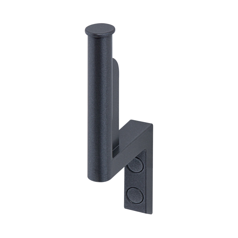 Spare toilet roll holder made of aluminium with scratch-resistant powder coating and antibacterial protection. The holder is equipped with an accommodating element shaped for vertical fixation of a paper roll.