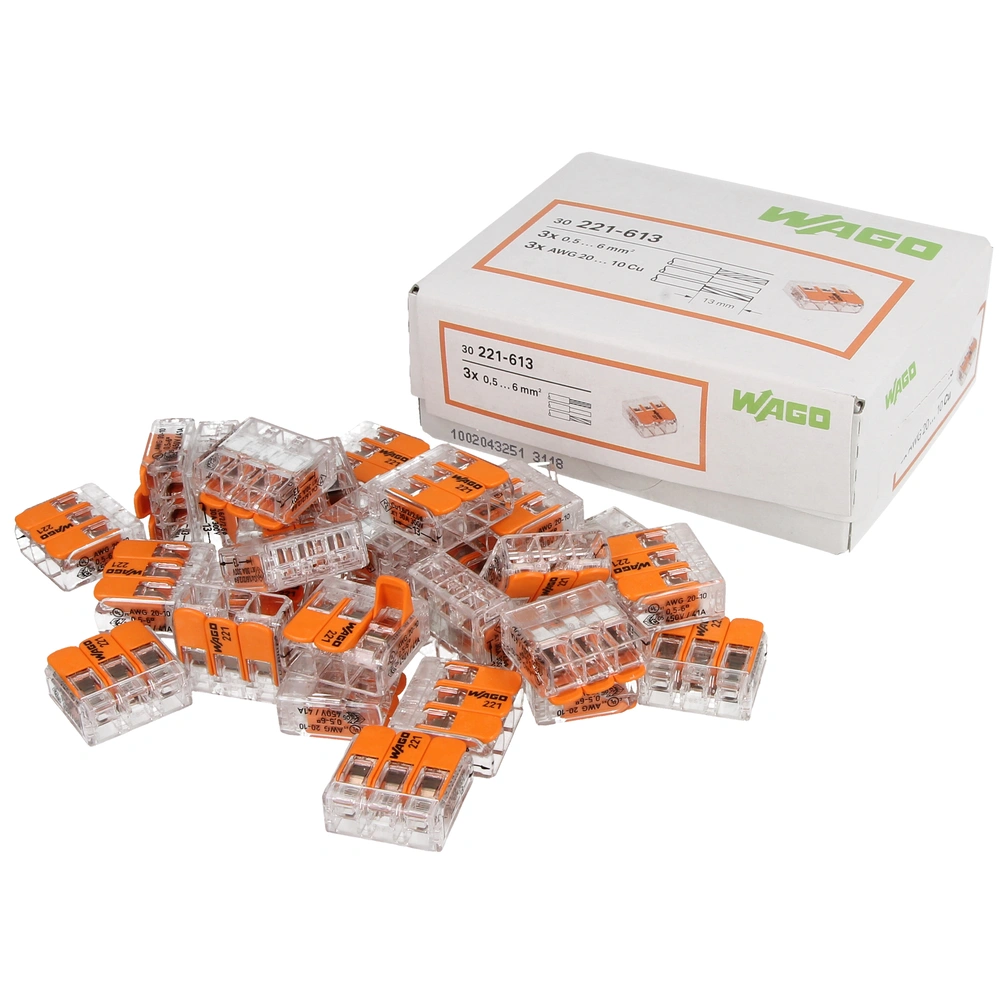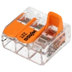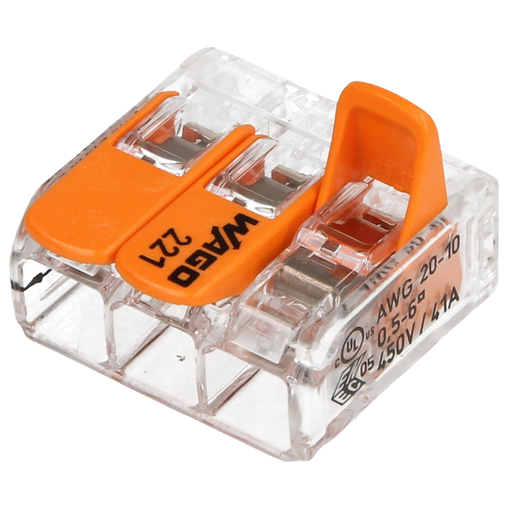 Splicing connector for connecting fine-stranded, solid and stranded conductor types. The integrated levers allow for easy opening and ensure a fast insertion of the conductors. The transparent housing allows you to visually check the correct position and stripping length. For the current test, even in installed condition, there are two test slots for all standard test probes. While connecting the conductor, both recessed handles on the sides ensure an easy, secure grip on the conductor.