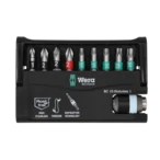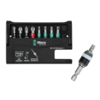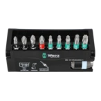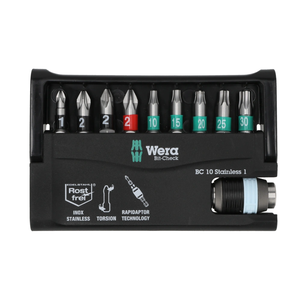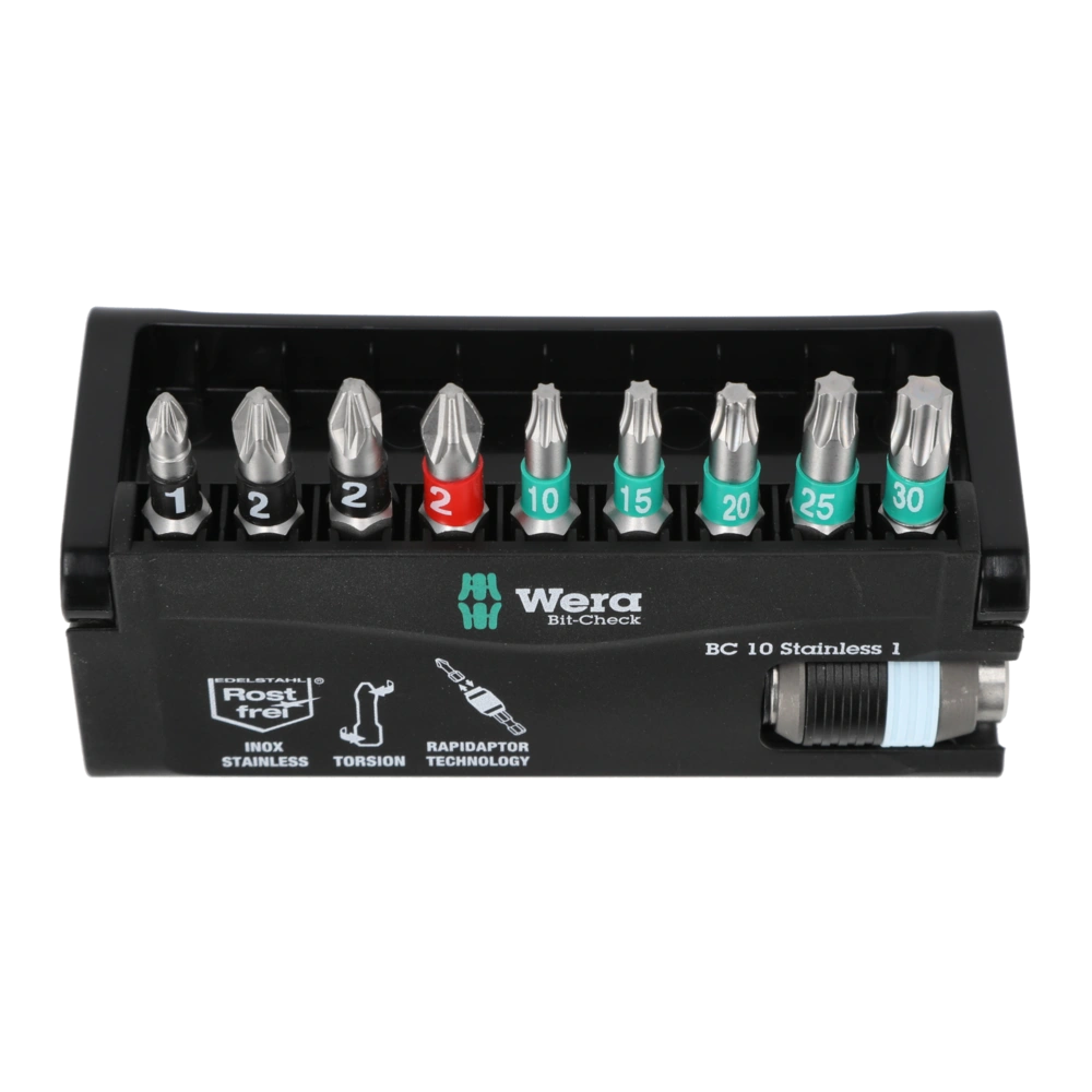 Bit set made of high-grade stainless steel that prevents foreign rust from adhering to stainless steel screws. The compact set in the tiltable plastic cassette includes a stainless steel holder with quick-change mechanism and 9 wear-resistant stainless steel bits with practical colour coding.