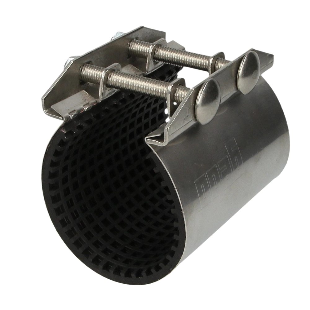 Sealing band made of V2A stainless steel with EPDM sealing surface for sealing holes, cracks and porous areas in water-bearing pipes with smooth surface.