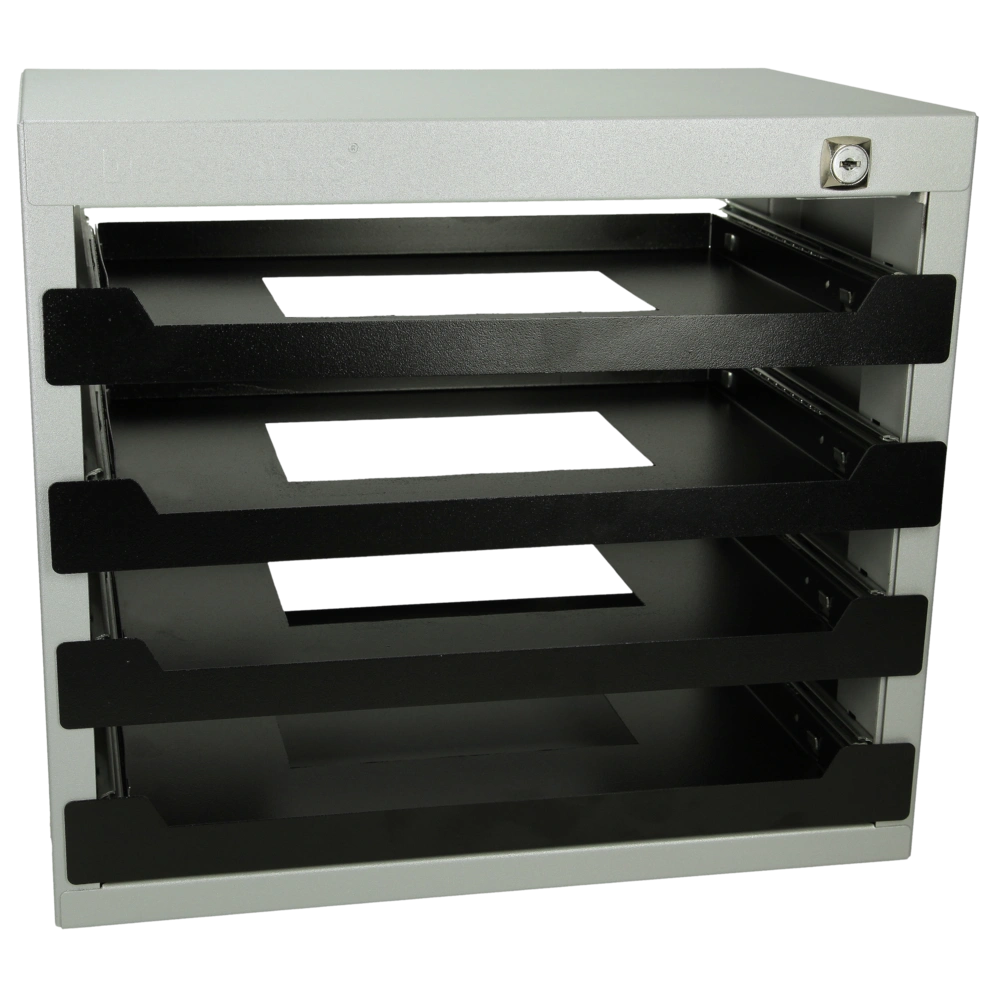 Empty storage cabinet for metal boxes with various inserts. The cabinet can be installed in vehicles or workshops and is lockable to secure the contents of the cases.