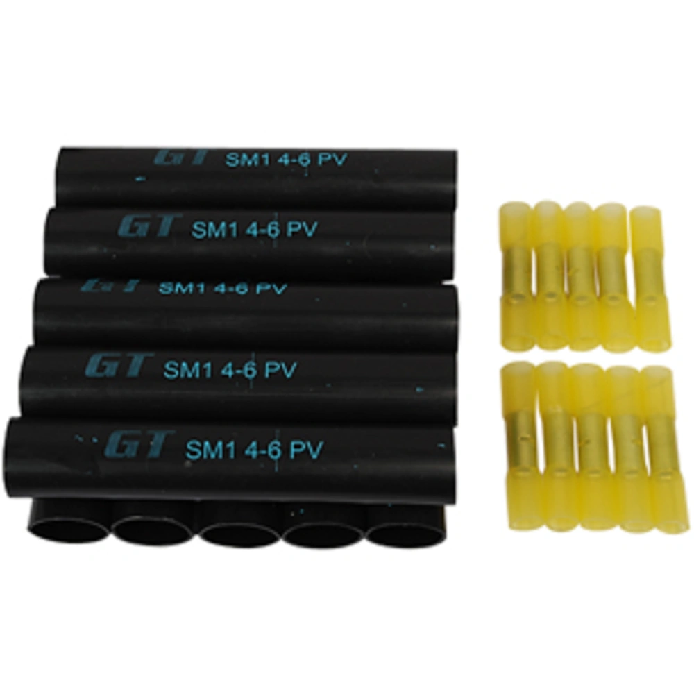 Straight-through joints for quick and secure connection or repair of lines for photovoltaic systems. With heat-shrinkable compression ferrules they are universally usable for single-core lines with cross-section 4 or 6 mm2...