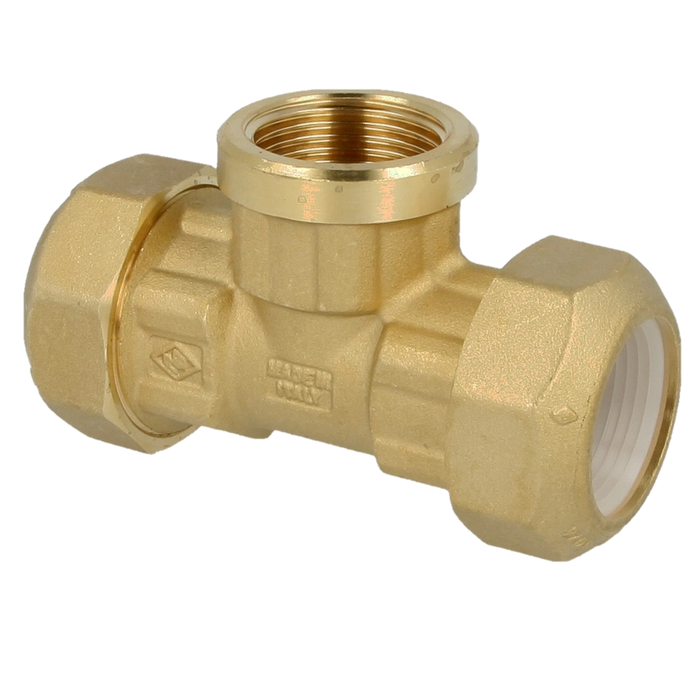Brass compression fitting with compression ring made of resin for the connection of PE and PVC pipes in drinking water installations.