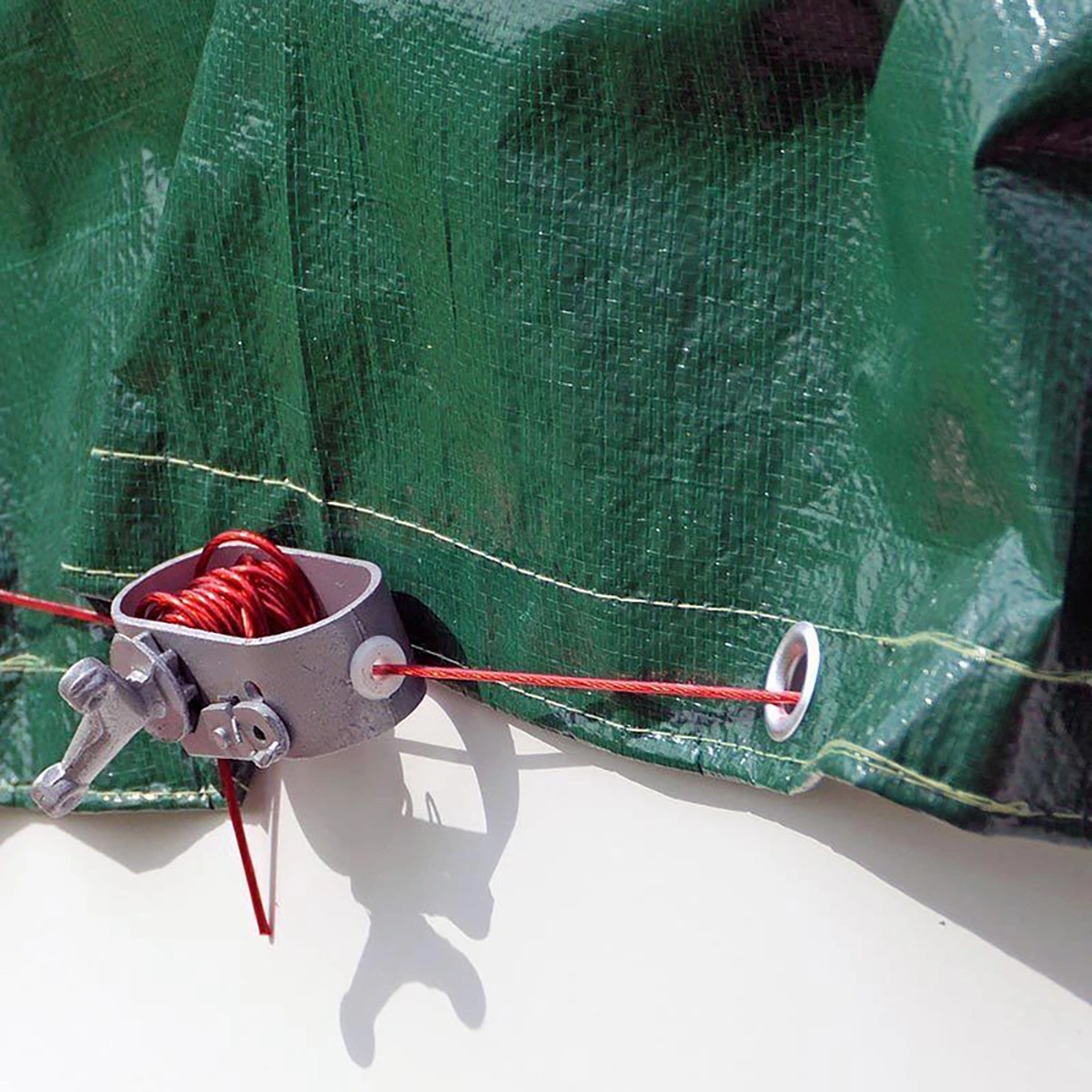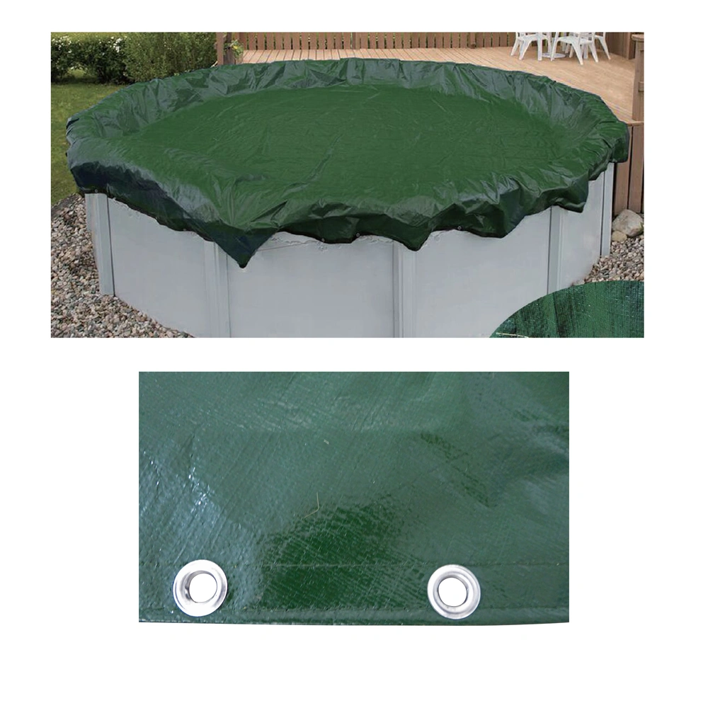 All product information Scope of deliveryTarp kit for above-ground pools. The tearproof reinforced tarp fabric has a green top and a black underside to prevent algae formation in the water. The steel rope is guided through the circumferential eyelets and tightened around the pool edge with the turnbuckle. The waterproof tarp can be used all year round.