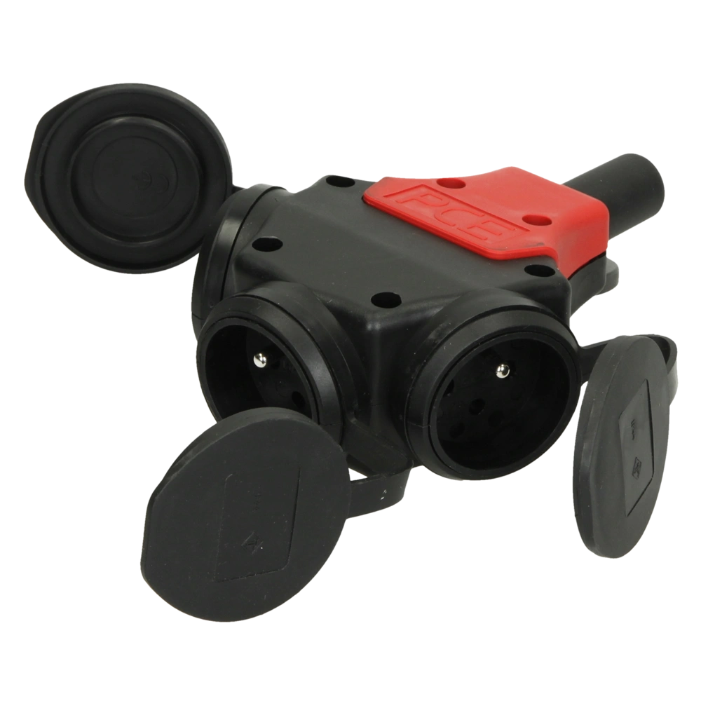 The PCE Taurus 3-way safety connector with earth contact made of rubber is ideal for difficult conditions. The snap-type or self-closing hinged lids provide high protection against moisture.