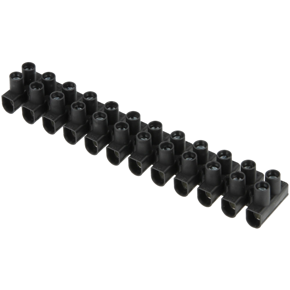 All product informationThe terminal strips without wire protection are equipped with twisted screws and clamping bolts. The housing is made of polyamide and self-extinguishing acc. to UL 94V2. The clamping bolts are made of nickel-plated brass, the screws are made of galvanised steel. The terminals can be cut to length individually.
