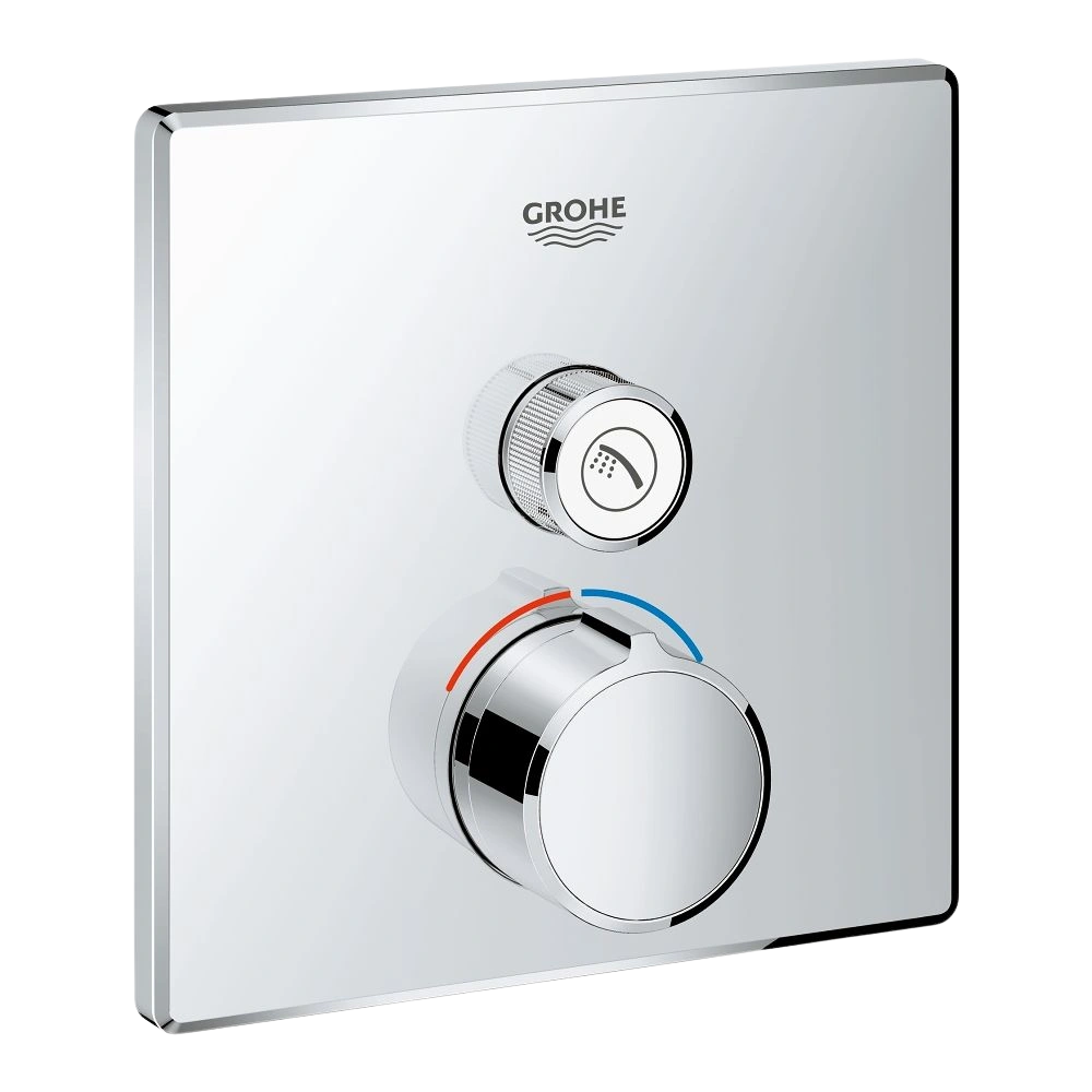 The GROHE SmartControl concealed shower mixer with one shut-off valves and the GROHE StarLight chrome finish is a set for final installation. The covered fixing of the wall escutcheon with covered escutcheon...