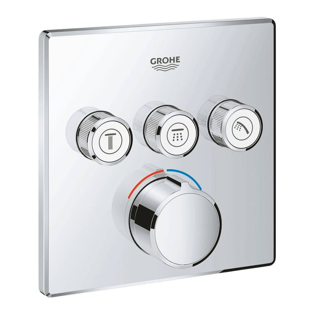 The GROHE SmartControl concealed shower mixer with three shut-off valves and the GROHE StarLight chrome finish is a set for final installation. The covered fixing of the wall plate with covered escutcheon and shaft sealing is subsequently adjustable by 6°. The GROHE SmartControl function allows for pushing the button to start or stop the shower and turning it to adjust the water volume and temperature. Multiple outlets can be used simultaneously. The symbols are exchangeable.