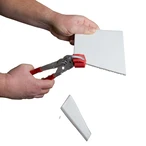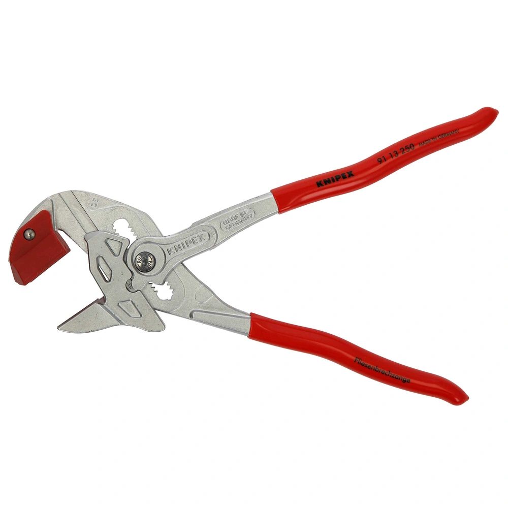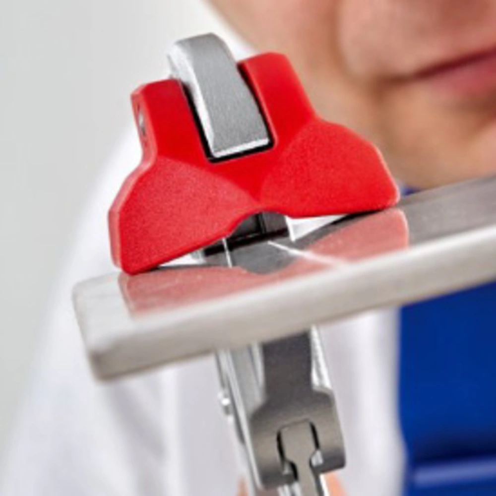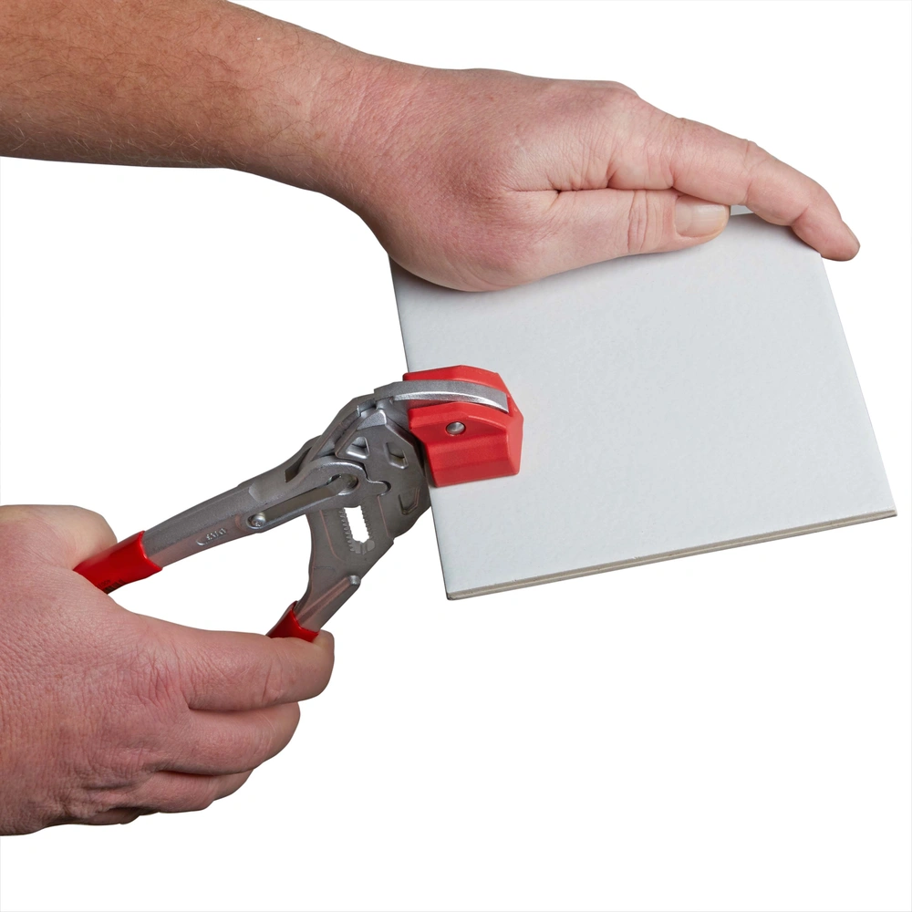 Pliers for precise breaking of tiles after scoring with a tile cutter. Great crushing force thanks to 10-fold increase of manual force. The curved plastic jaw protects the sensitive tile surface. The tile thickness can be easily adjusted at the press of a button.