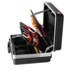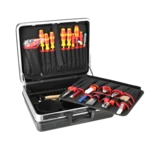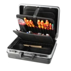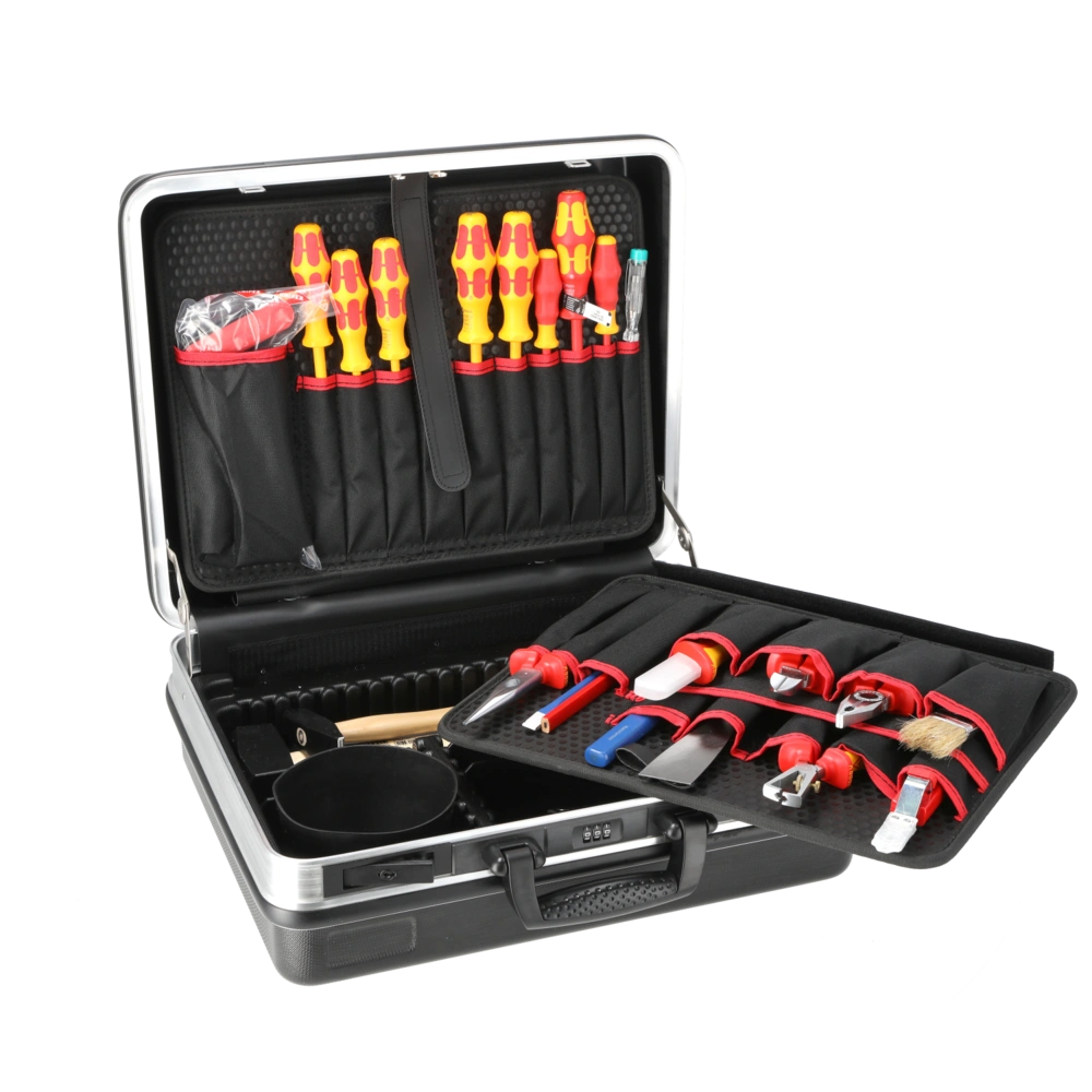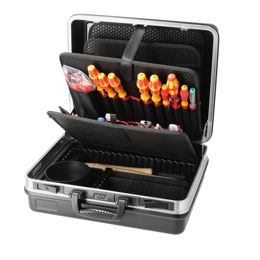 All product information Scope of deliveryFitted tool case with aluminium frame for trainees. An integrated document compartment ensures proper order and crease-free documents. The sturdy flip locks can be locked. The case is also provided with a combination lock. Loading capacity is 15 kg.