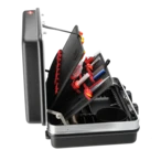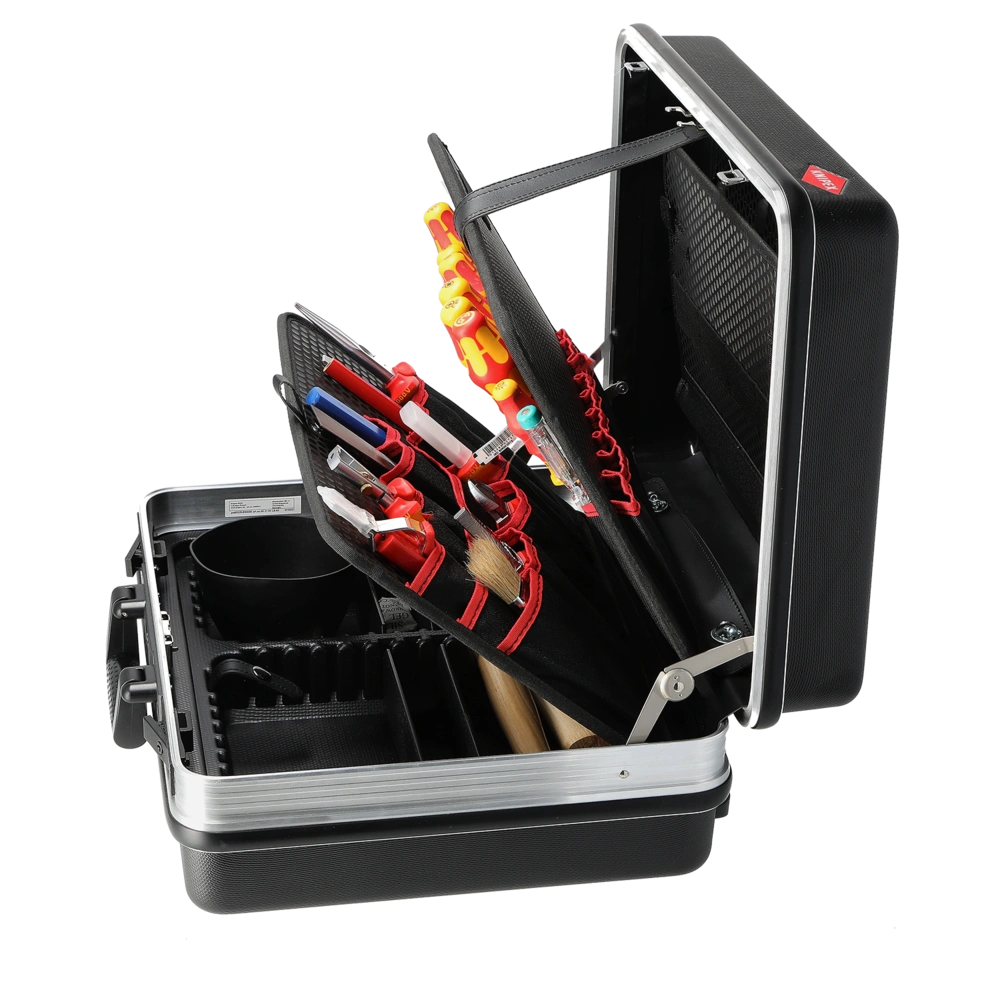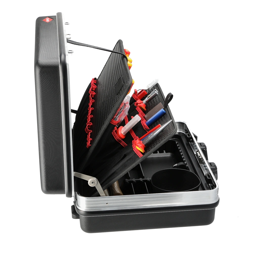 Fitted tool case with aluminium frame for trainees. An integrated document compartment ensures proper order and crease-free documents. The sturdy flip locks can be locked. The case is also provided with a combination lock...