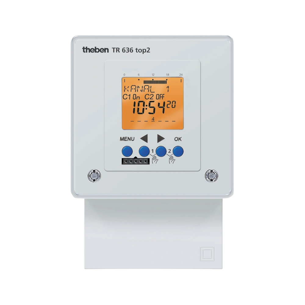 Programmes can be managed, stored and transferred externally via the OBELISK top2 interface. Operation is menu-guided via an illuminated LCD display and includes switching preselection, operating hours counter and PIN protection. With a power reserve of 10 years, long-term operational reliability is ensured even in the event of a power failure. The unit can be mounted either on the wall or in a control cabinet.