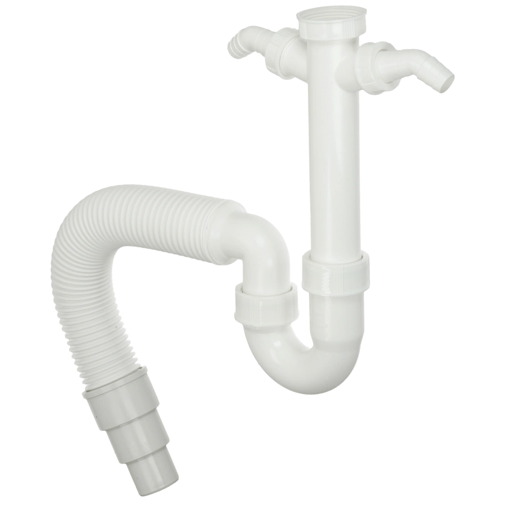Tubular odour trap made of plastic with 2 appliance connections and flexible outlet for confined space.