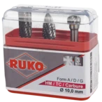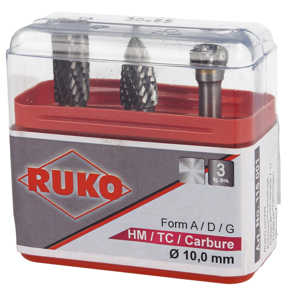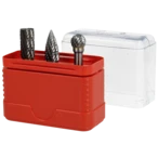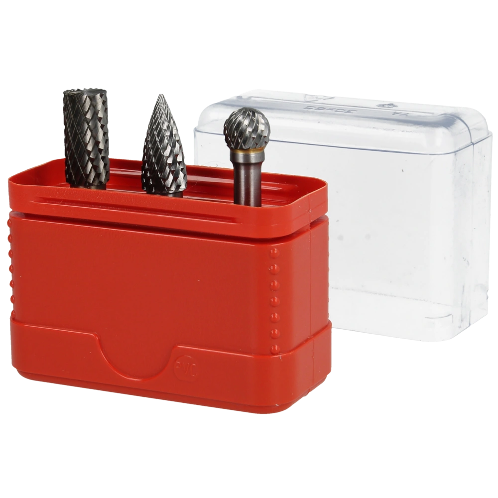 All product information Scope of deliveryThe tungsten carbide rotary burr set consists of 3 rotary burrs supplied in a practical plastic box. The right-hand cutting burrs have a cylindrical shank and are suitable for the use in steel, stainless steel, brass, cast iron and alloyed titanium.