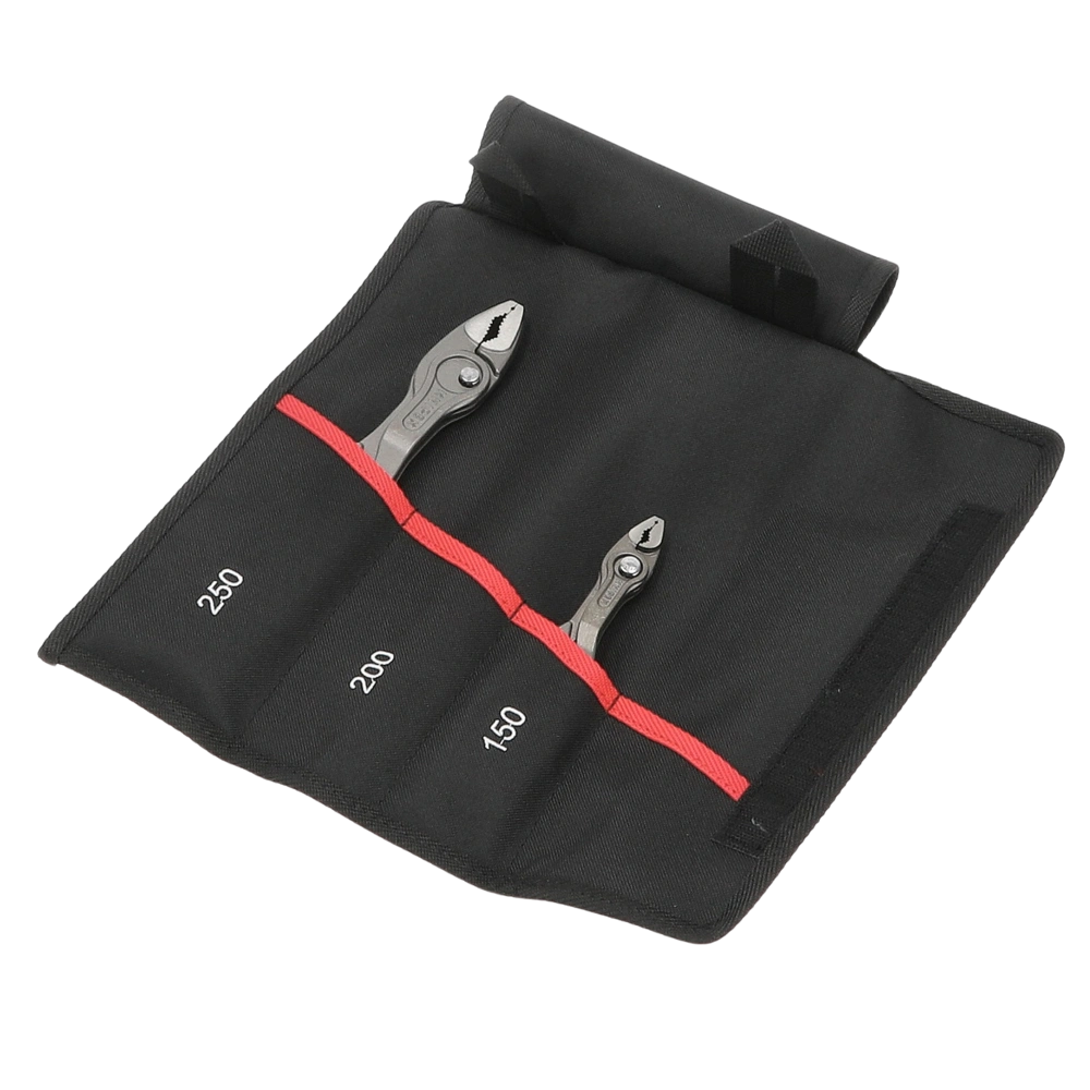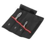 Front-gripping pliers set in a practical tool roll. The bag can be safely closed with a strong hook and loop fastener.