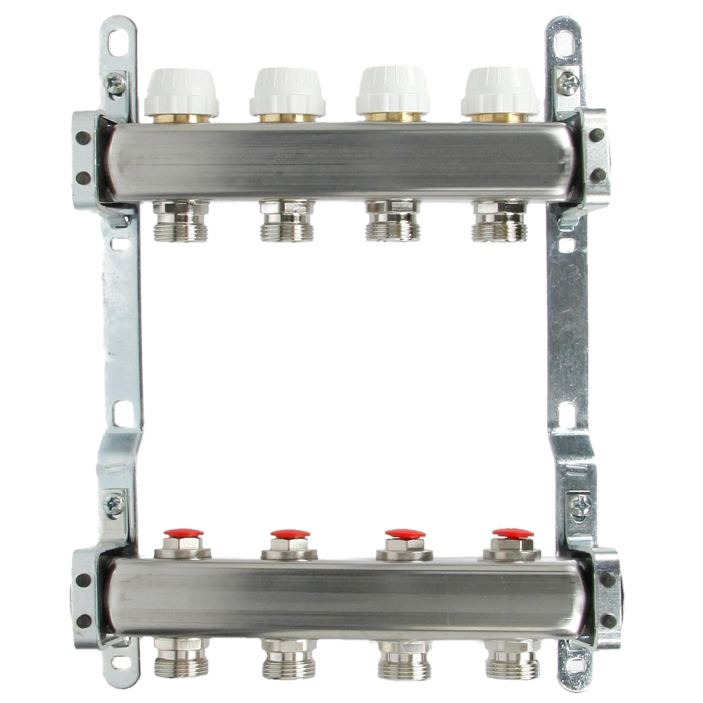 All product informationHigh-quality underfloor heating manifold with flow and return manifold bar mounted on two metal brackets. The return manifold is equipped with shut-off valves prepared for electrothermal control. The flow manifold bar has a return lockshield.