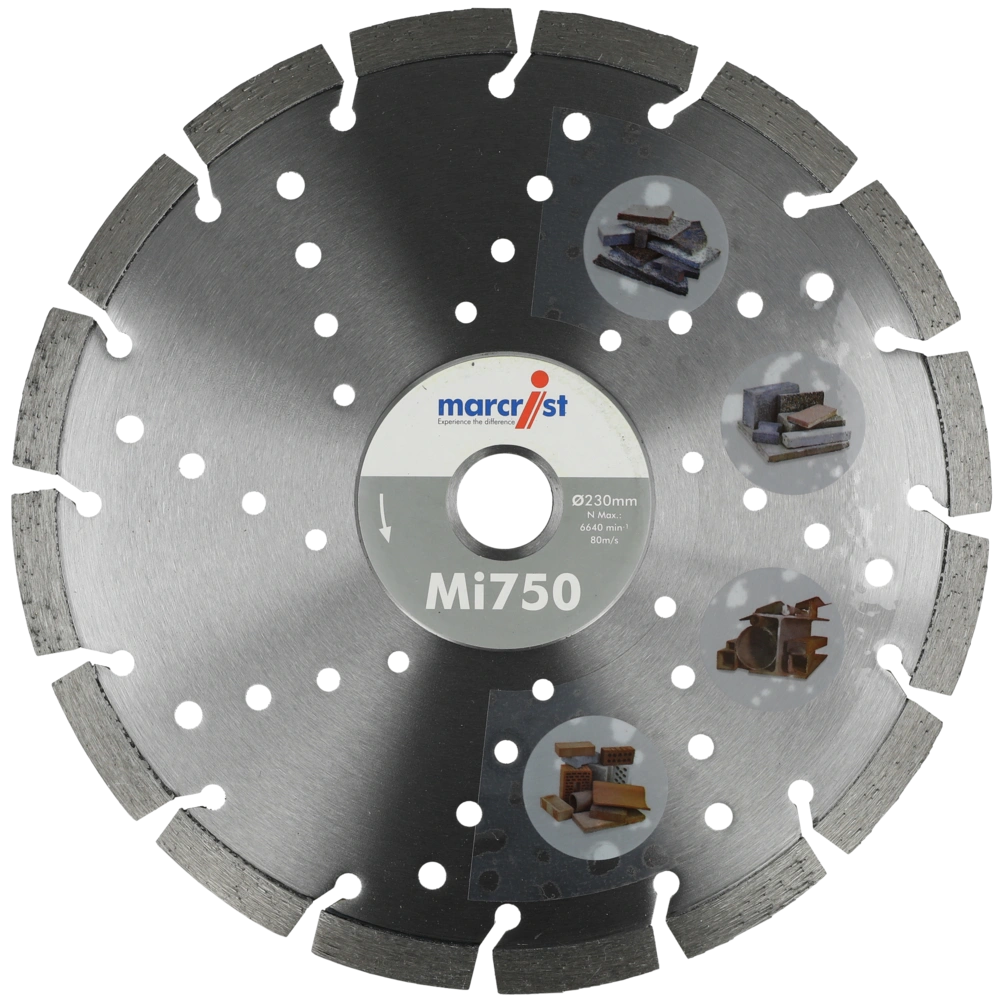 Universal diamond cutting blade for wet and dry cutting of roof tiles, bricks, concrete, natural stone, granite and reinforced concrete. The very durable disc is self-cooling and self-sharpening. It is noise-reduced and meets the safety requirements of DIN EN 13236.