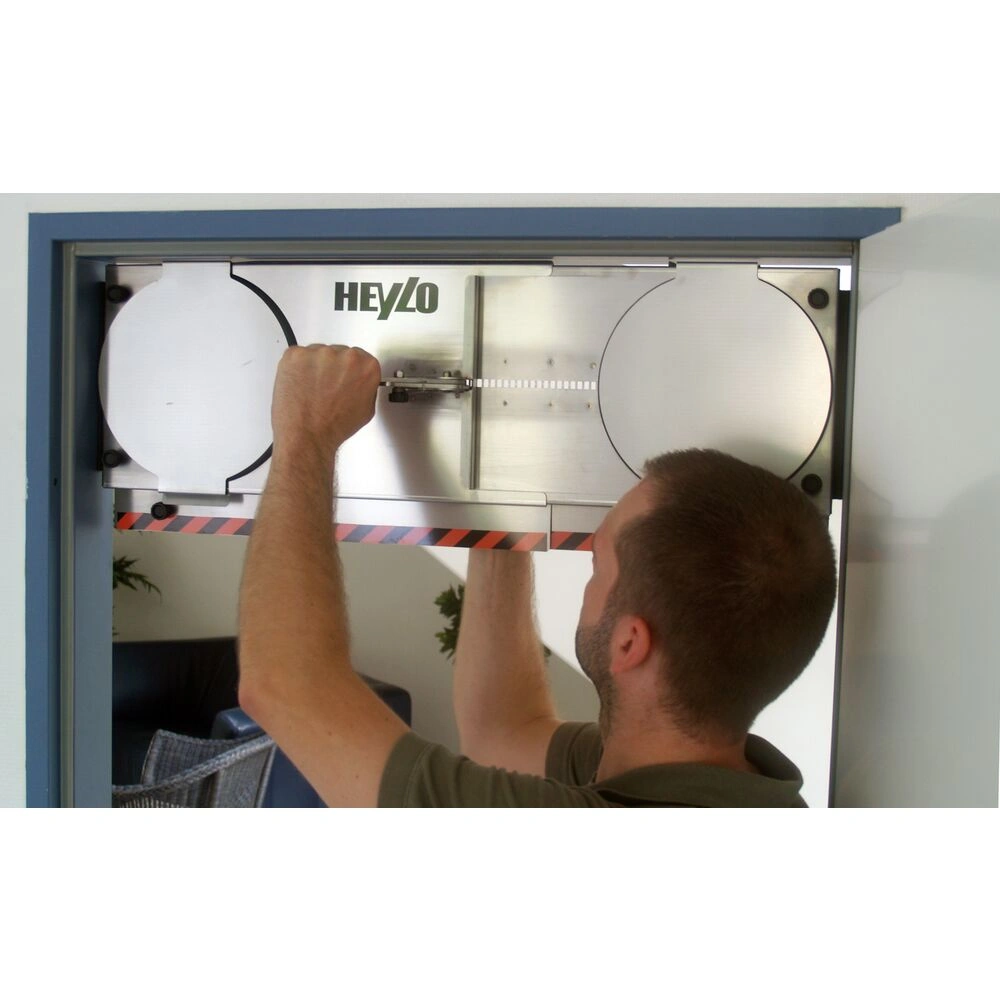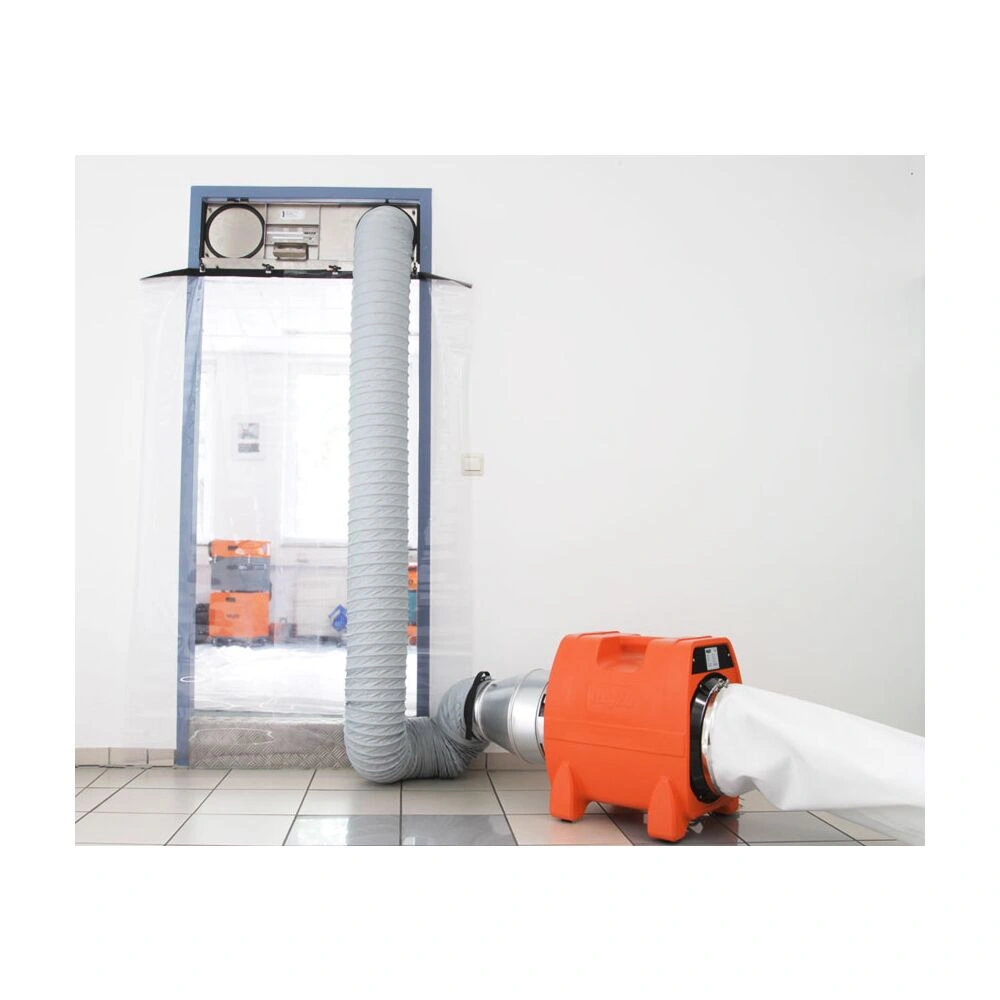 Thanks to the flexible stretch range for the door element and the quick-acting closure for the film, any door frame or opening can be reliably prepared for dust extraction by ventilator or for creating negative pressure by the air filter. By using the appropriate adaptor, even unusual door sizes can be covered.