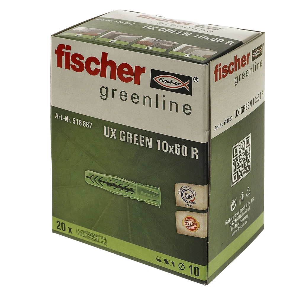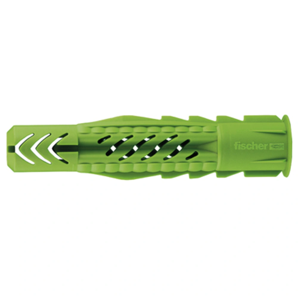 Universal wall plug for pre-positioned installation in almost all building materials. For maximum hold, the plug expands in solid building materials and knots in hollow and panel building materials. The serrated anti-rotation locks ensure maximum installation safety, and the plug rim prevents the wall plug from slipping deeper into the drill hole. Slanting connection bridges ensure optimum screw guidance. The wall plug is made of at least 50% renewable raw materials.