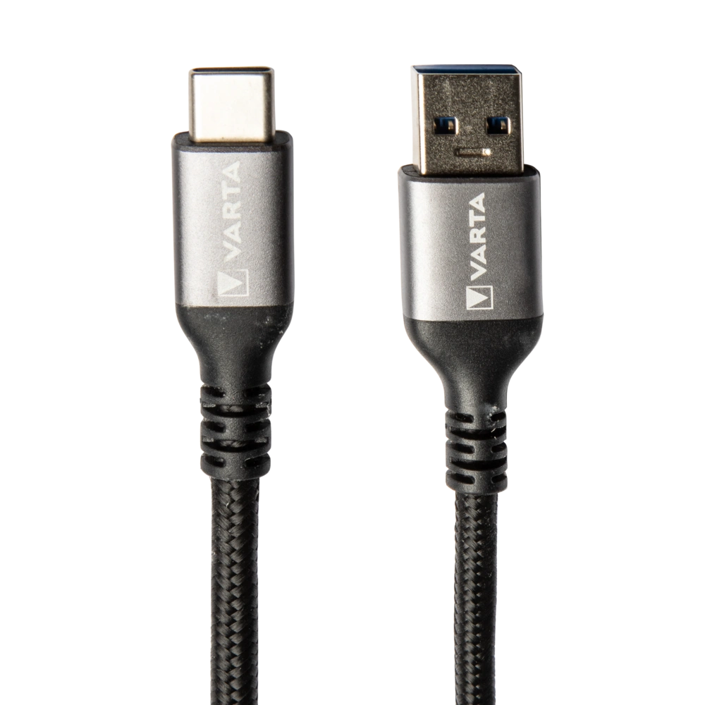 USB A cable with a USB C connector for charging or transmitting data.