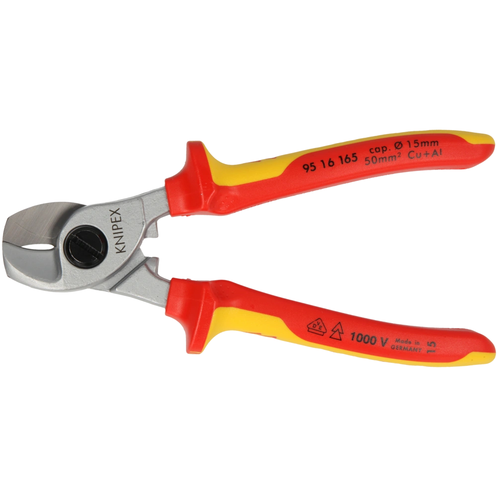 The cable shears are used for cutting single- and multi-wired cables. The hardened, precision-ground blades cut cleanly and smoothly without crushing and deformation.The shears provide for an easy cut in single-hand operation. The cable shears is fitted with a pinch guard, adjustable screw joint and is self-locking. The handles are insulated.