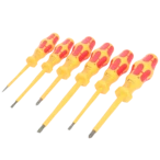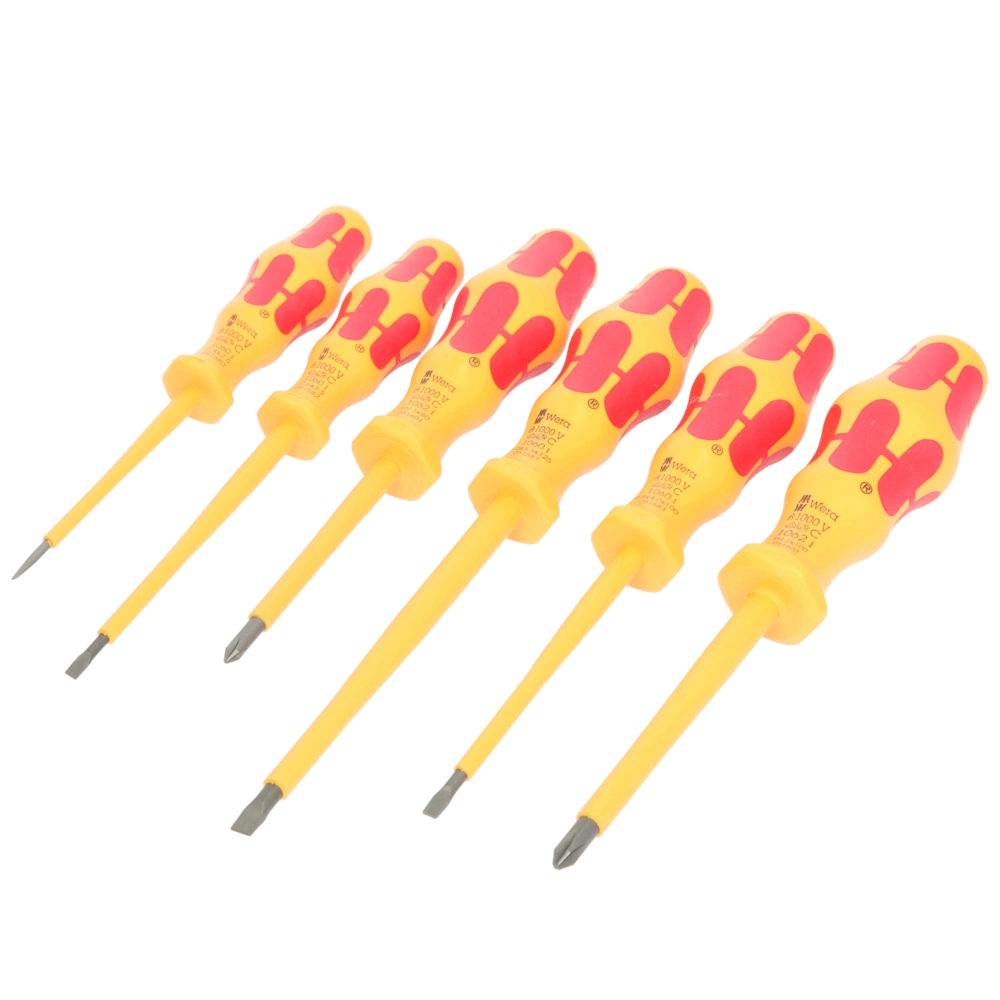 Screwdriver set for the use in industrial and commercial applications. The ergonomic multi-component handle made of high-quality plastic protects your palms and ensures comfortable, fatigue-free working. The Wera Black Point tip with exact fitting accuracy guarantees a long usability and optimal corrosion protection. Each screwdriver from this 6-piece set has been individually tested at 10,000 V for its dielectric strength to ensure safe working at the approved voltage of up to 1,000 V. The hexagon anti-roll protection avoids bits from rolling away at the workplace. The handles are marked to find and sort the right tool quickly.