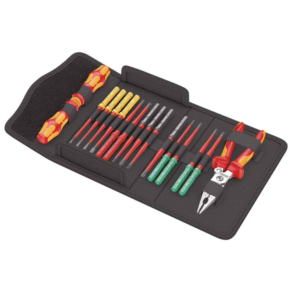 The set is completed by a high‑quality combination plier for common tasks such as cutting, stripping, crimping and bending, all stored in the supplied belt pouch that can be attached flexibly to a tool trolley or the Wera 2go system.