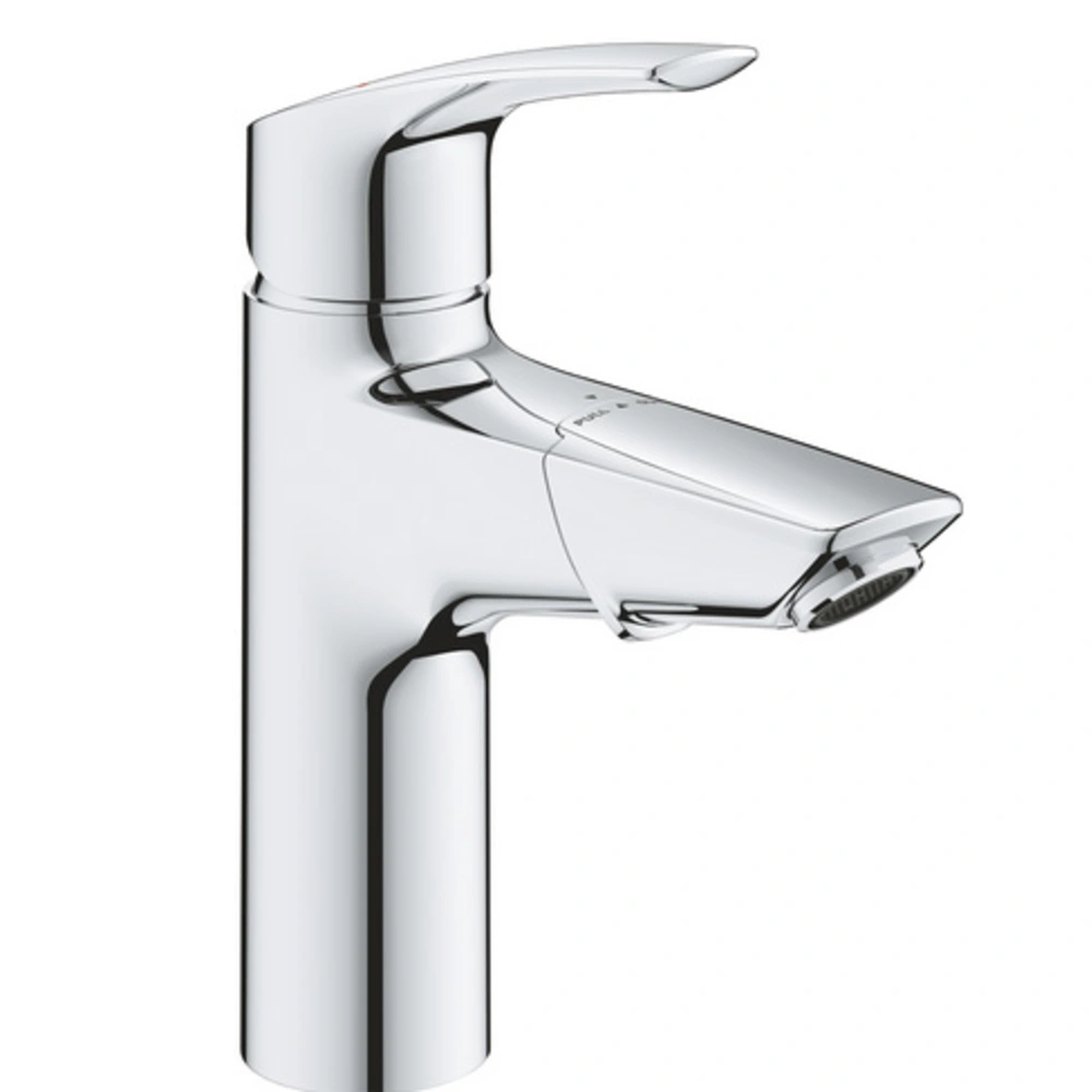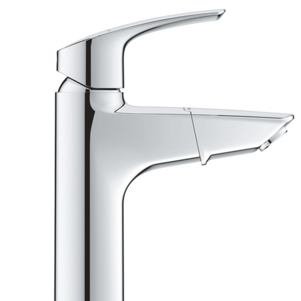 Single-lever basin tap with waste set and pull-out spout for single-hole installation. The tap has a ceramic cartridge with temperature limiter and variably adjustable flow rate limitation. The surface is scratch-resistant, and limescale deposits can be removed easily. With the installation system and flexible connection hoses the tap can be fitted quickly and easily.
