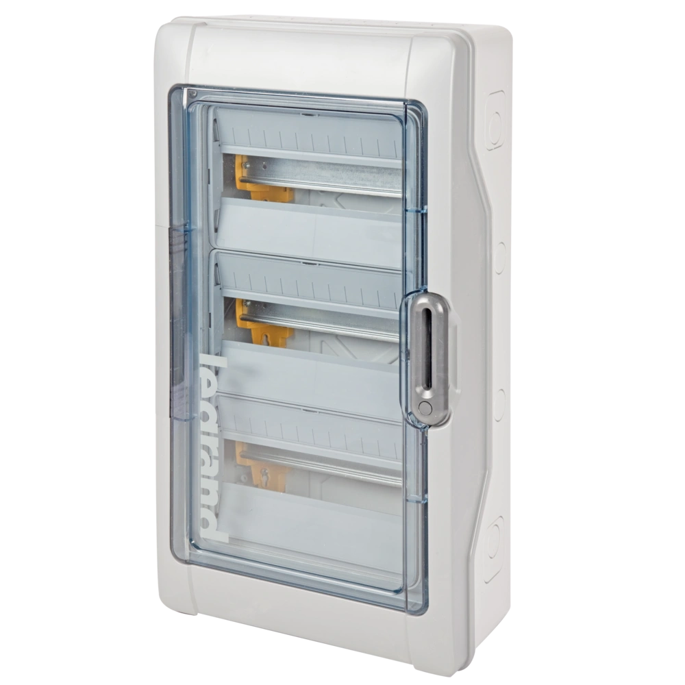Weatherproof distribution board for the installation in garages, carports and stables. It protects electrical components against water and dust. The robust enclosure can withstand even harsh conditions. The transparent door is reversible and can be retrofitted with a lock. Devices with an installation depth of 48.5 mm and up to 63 A can be fitted in the height-adjustable distributor rows. The support rail provides enough space for a hardly visible wiring. A rail with N terminals and PE terminals is also pre-installed. Pre-punched cable entries make for a simple laying of the cables in the distributor.