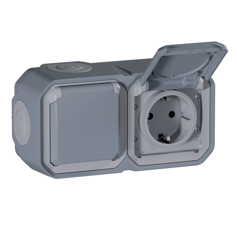 Surface-mounted double Schuko socket outlet for wet rooms. This enclosure offers ample space for through-wiring of cables.