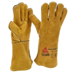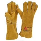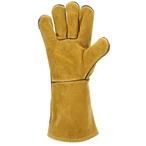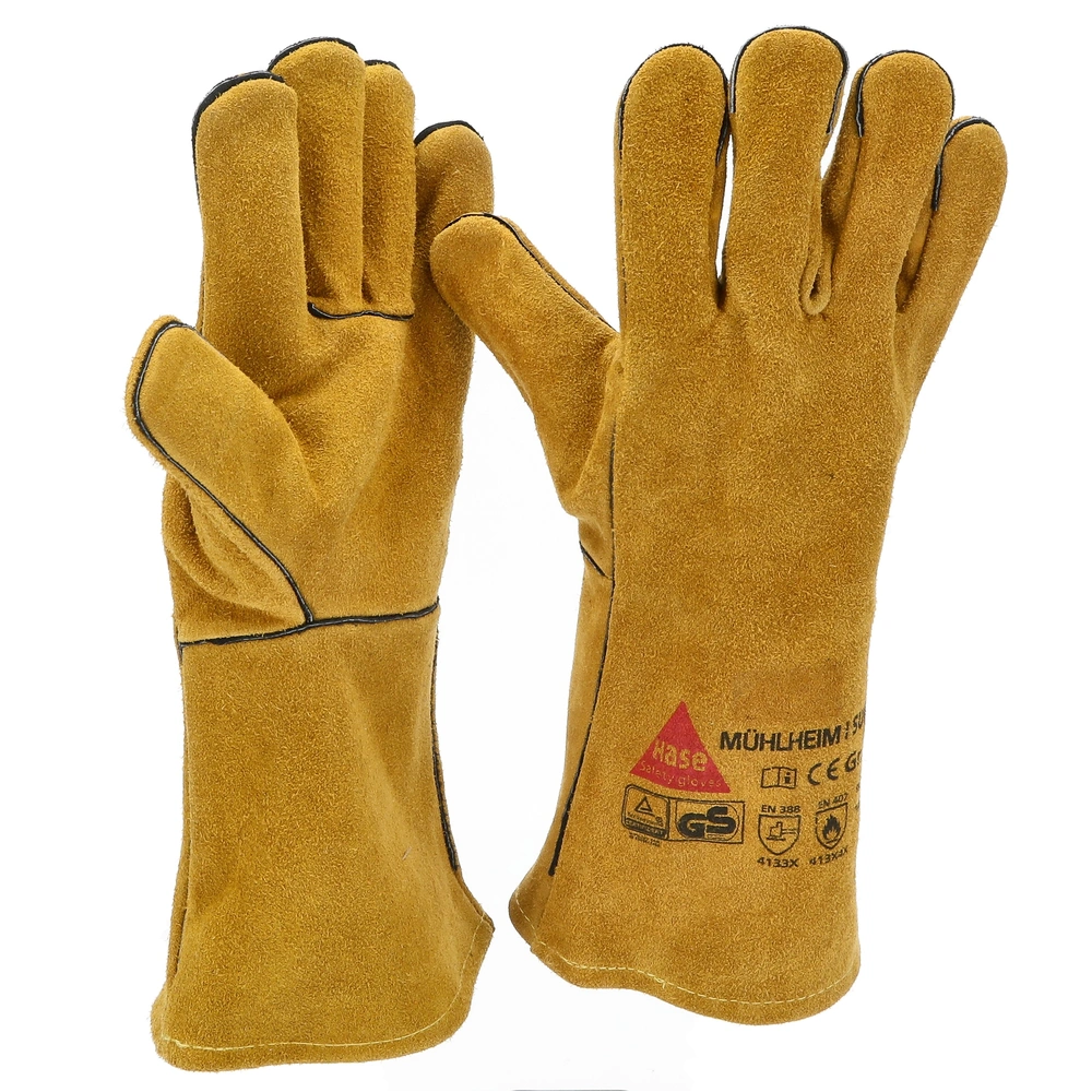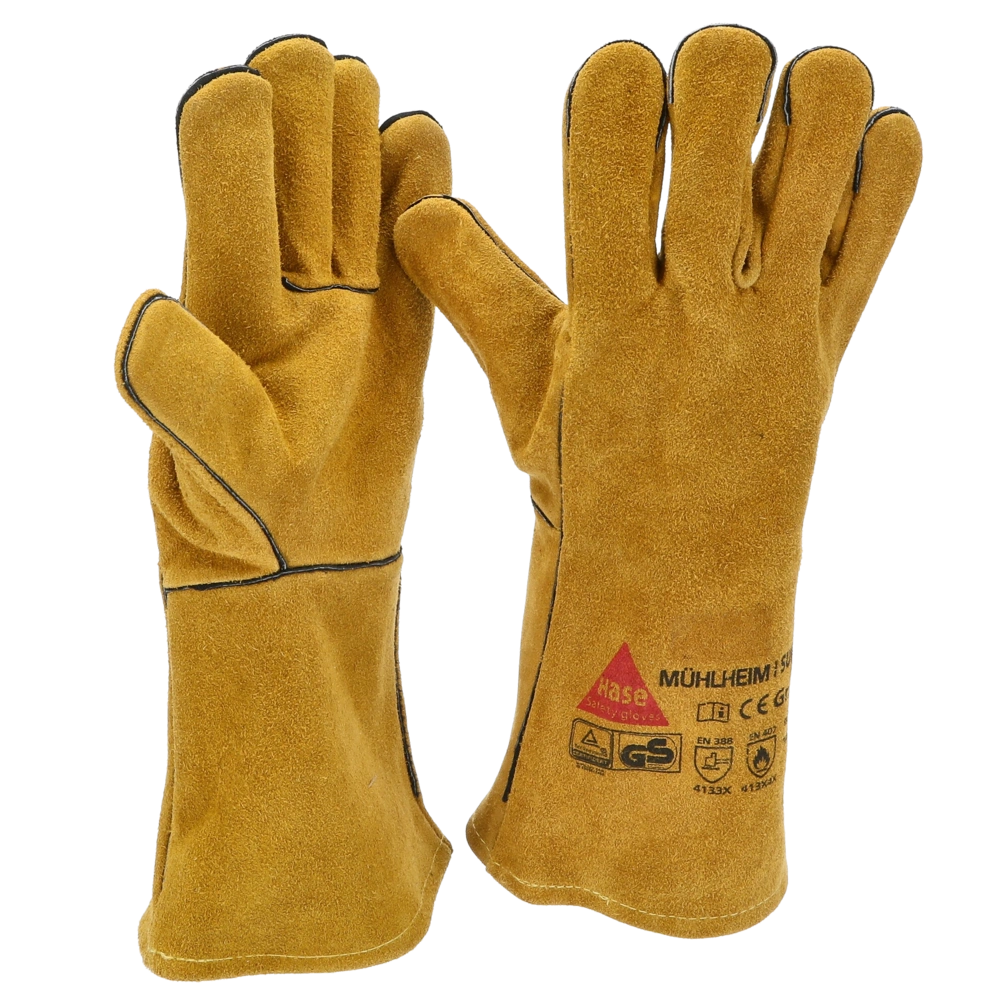Robust welding gloves made of cow split leather with full hand lining for high wearing comfort. German TÜV GS-tested for reliable protection during welding work.