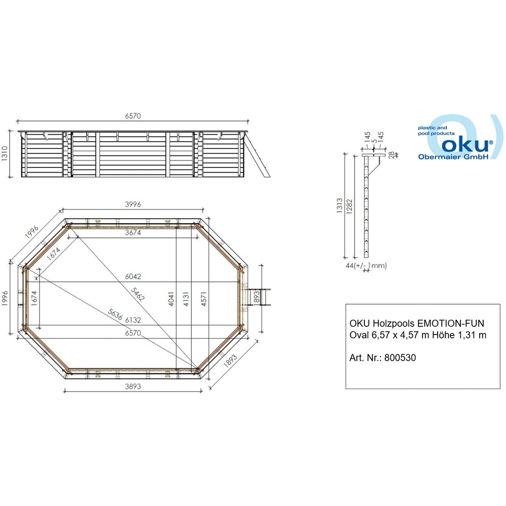 This pool made of pressure-impregnated wood is suitable for freestanding as well as partially or fully in-ground construction. The kit includes a hard-wearing pool liner, floor protection fleece, skimmer set, wooden steps and a stainless steel ladder. The pool is winter-proof, suitable for salt water and offers a 5-year guarantee on the wooden construction.
