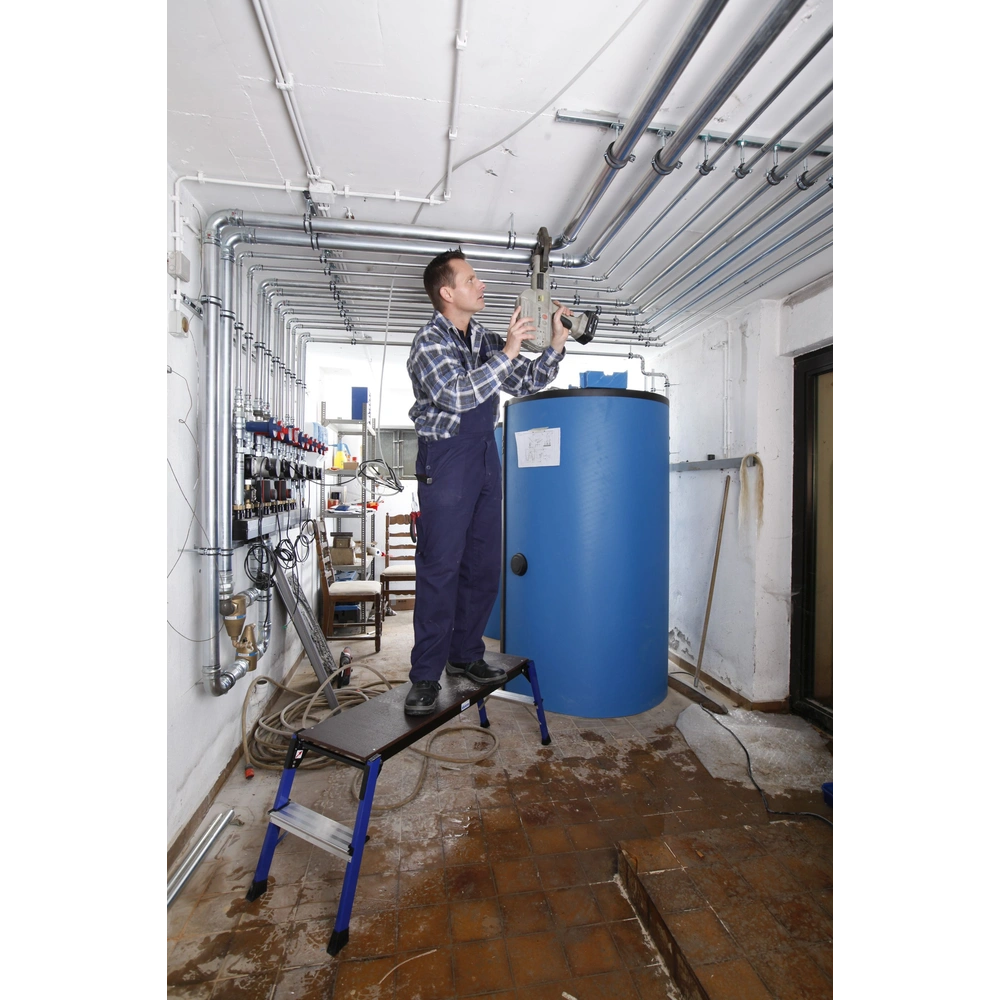 All product informationThis work platform "Step Top" is a foldable, sturdy aluminium work platform. It is ideal for interior construction work with ceiling heights of up to approx. 2.50 m. Asafety lock on both sides prevents unintentional folding. IT is provided with multi-riveted, reliable step/rail joints with 4 additional stable corner braces. Large-dimensioned, non-slip foot caps ensure a safe stand.