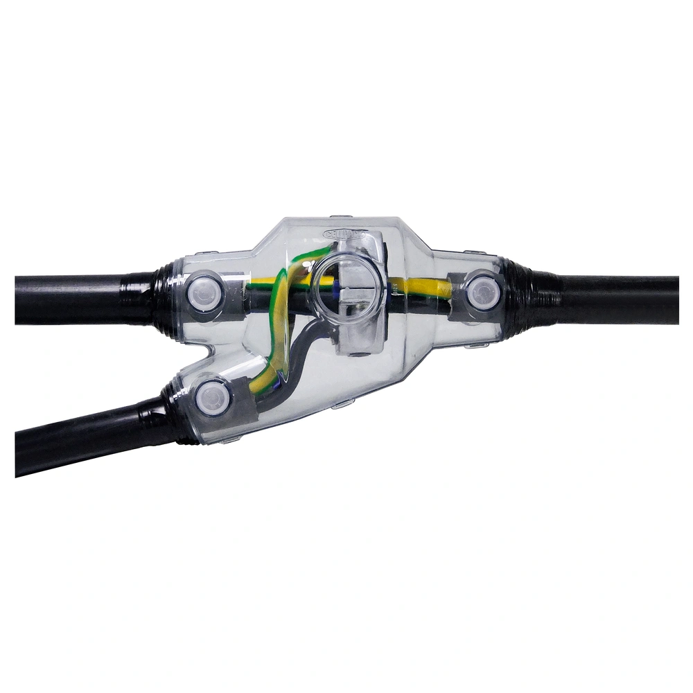 Joint for watertight connection of conductors insulated with PVC, PE, VPE and EPR. The joint is suitable for compression and screw connectors on aluminium and copper conductors and can be used indoors, outdoors, in soil and in water. It is halogen-free, watertight and resistant to chemical influences, alkaline earths and UV rays. The transparent, moulded shell with large filling opening consists of impact-resistant plastic. The hydrolysis-resistant, high-quality 2-component PUR cast resin can be processed easily and in a clean way.