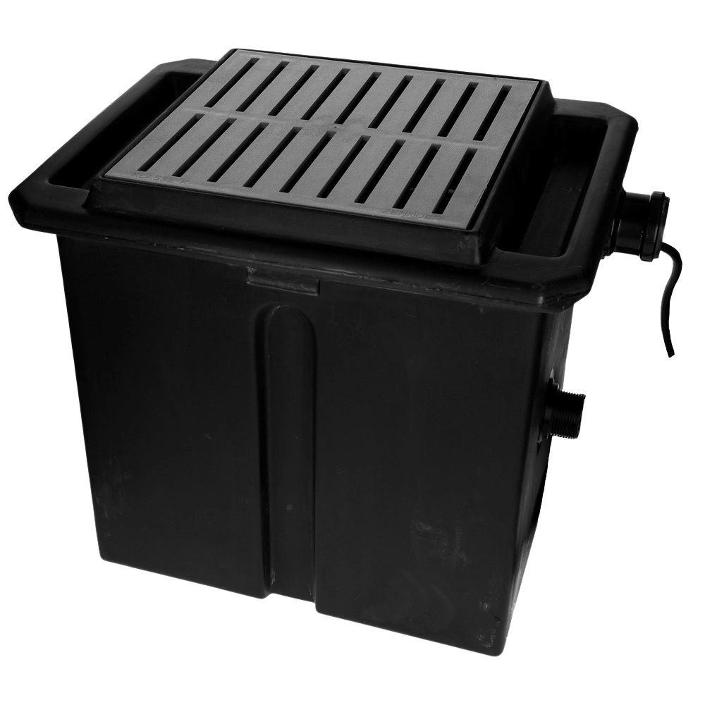 The waste water lifting unit (under ground) is suitable for the pumping of domestic waste water without faeces from washing machines, showers and washbasins. The unit features a collecting container made of polyethylene with 20 l net capacity, a siphon and sand trap as well as an accessible plastic grating cover. The integrated waste water submersible pump is equipped with a float switch. The port for air vent and cable gland is DN50 (HT) each, the inlet connection piece DN50 (HT) is also included and can be installed by drilling a hole in the container on-site.