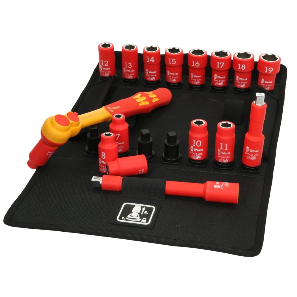 The Wera VDE ratchet set is a suasive tool set with slim design and soft grip zone for easy working also in confined spaces. Due to the VDE certification of the tools, working is safe for voltages of up to 1,000V. The particularly fine toothing of only 80 teeth provides a short return angle of the ratchet. The supplied textile box is robust, durable and can be positioned upright for clear storage in the workshop shelf.