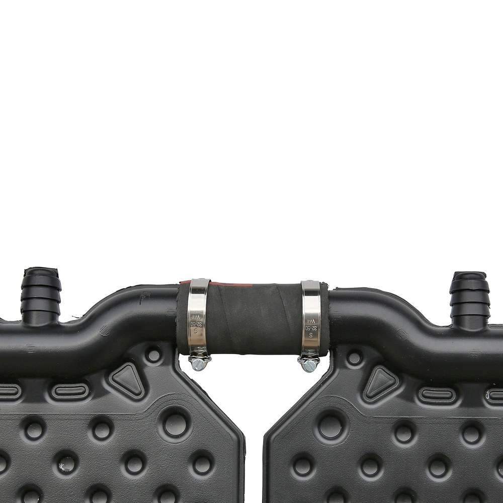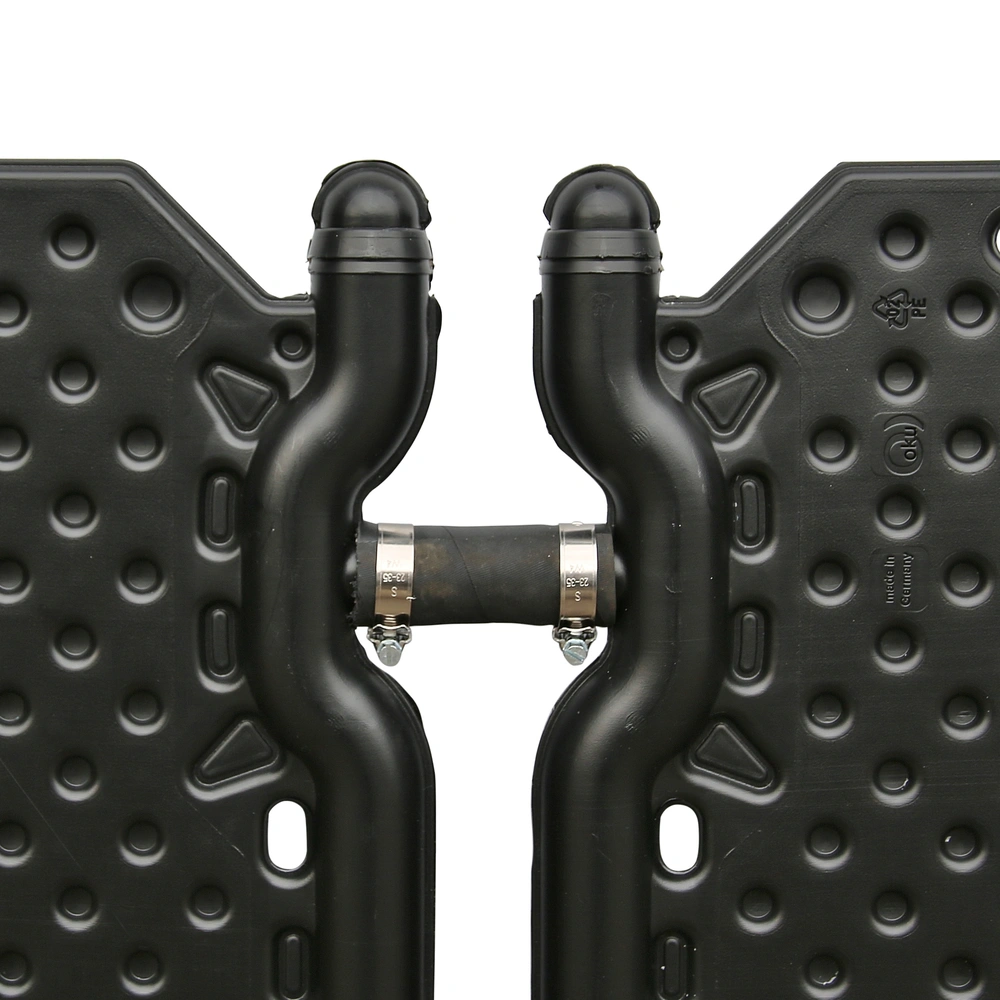 Absorbeur solaire universel de haute qualité avec 2 tubes collecteurs et 4 tubulures de raccordement pour le chauffage de piscines et de bassins en circuit direct. Pour un fonctionnement dans le circuit de filtration déjà existant avec la pompe de la piscine ou du bassin.