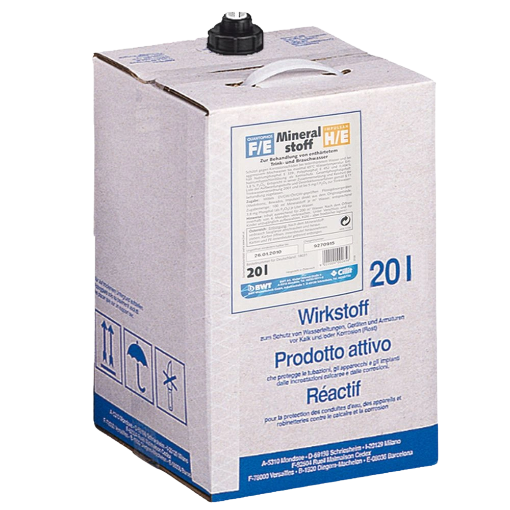Combinaison de substances minérales pour le traitement de l'eau potable et industrielle douce et agressive avec une plage de dureté de 1 à 7 °dH. L'agent actif de dosage protège les systèmes d'installation en acier galvanisé contre les dépôts de calcaire. La solution concentrée de monophosphate offre une protection contre les germes, forme une couche protectrice dans les tuyaux et convient en outre à l'assainissement en cas de corrosion déjà existante.