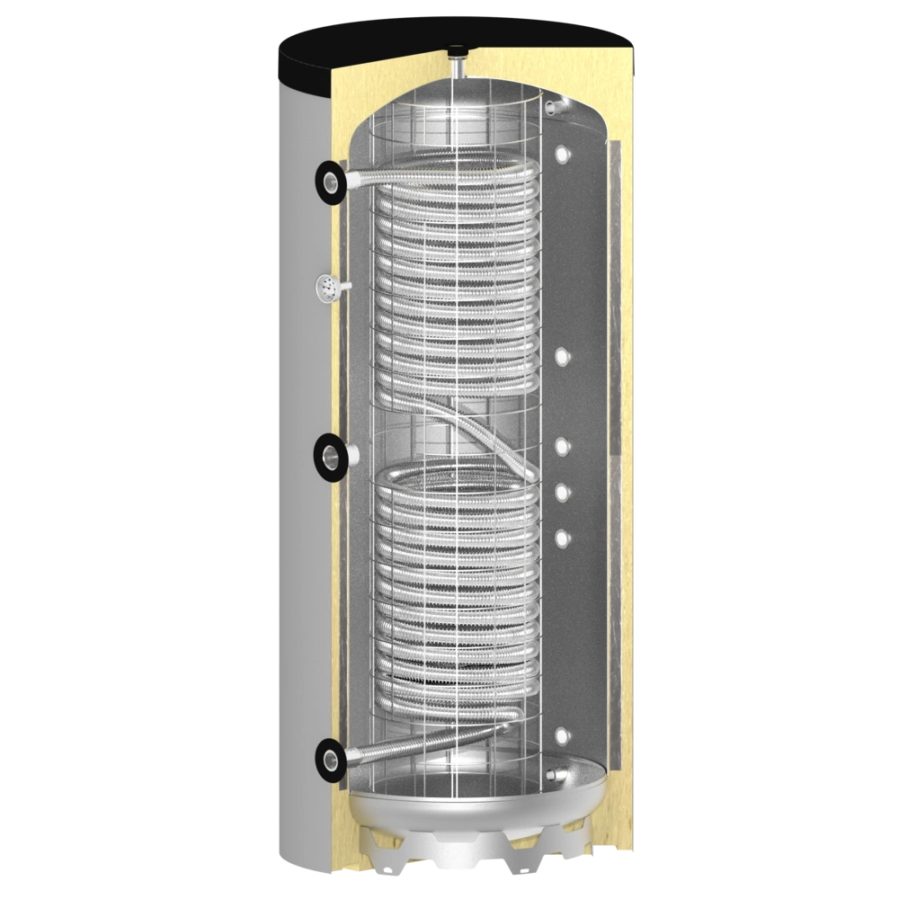La structure du ballon se distingue fondamentalement des ballons d'eau sanitaire habituels de grand volume. Un tube ondulé en acier inoxydable intégré sépare l'eau potable de l'eau de chauffage et sert également d'échangeur thermique performant. Les avantages d'un ballon tampon sont ainsi combinés à ceux d'un chauffe-eau instantané.