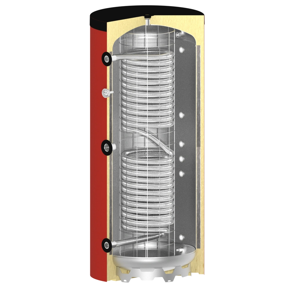 La structure du ballon se distingue fondamentalement des ballons d'eau sanitaire habituels de grand volume. Un tube ondulé en acier inoxydable intégré sépare l'eau potable de l'eau de chauffage et sert également d'échangeur thermique performant. Les avantages d'un ballon tampon sont ainsi combinés à ceux d'un chauffe-eau instantané.