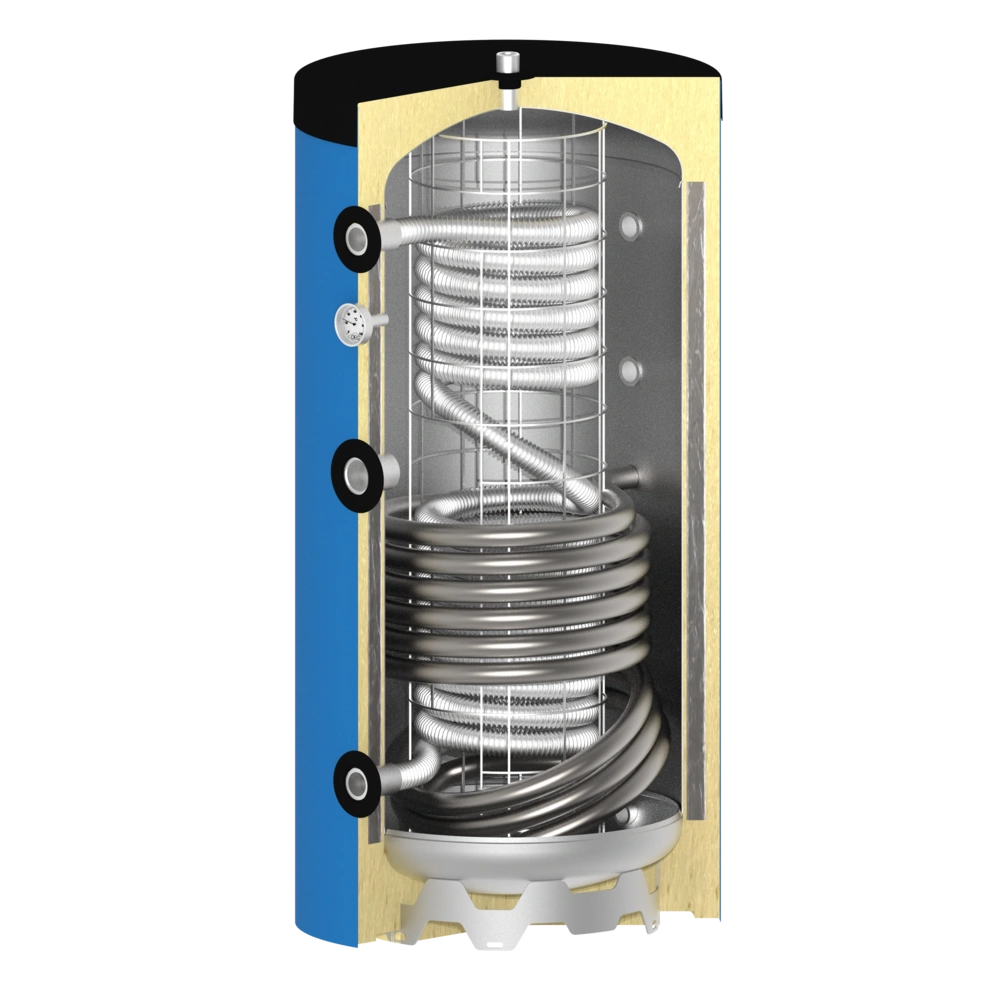 La structure du ballon se distingue fondamentalement des ballons d'eau sanitaire habituels de grand volume. Un tube ondulé en acier inoxydable intégré sépare l'eau potable de l'eau de chauffage et sert également d'échangeur thermique performant. Les avantages d'un ballon tampon sont ainsi combinés à ceux d'un chauffe-eau instantané.