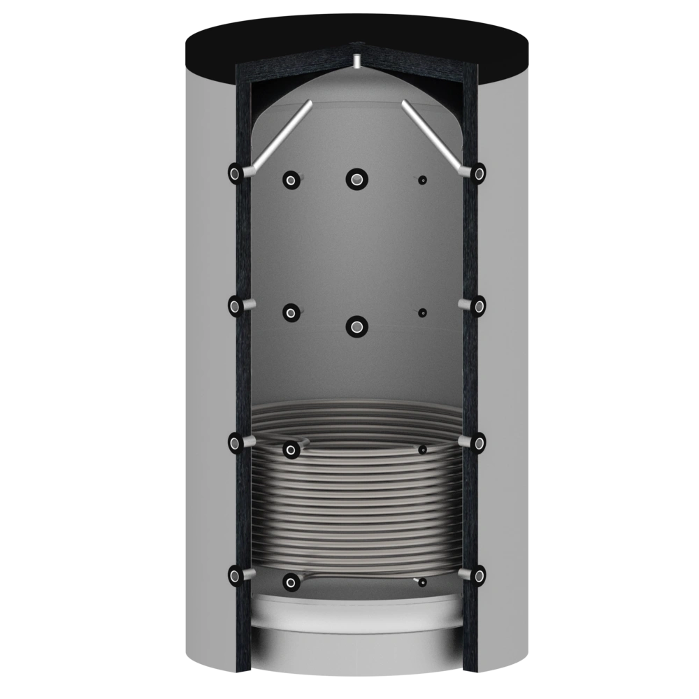 Le ballon tampon OEG convient comme accumulateur de charge pour le solaire, les pompes à chaleur, les chaudières à bois et à pellets et peut également être utilisé pour le chauffage urbain. Grâce aux deux échangeurs de chaleur à tubes lisses supplémentaires, il est possible d'intégrer d'autres générateurs de chaleur et d'injecter leur énergie en plus dans le ballon tampon.