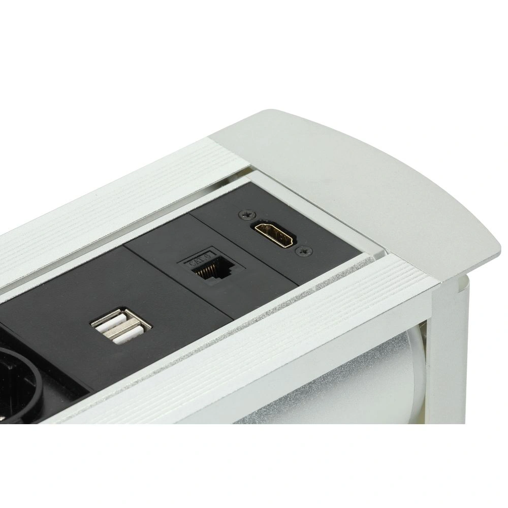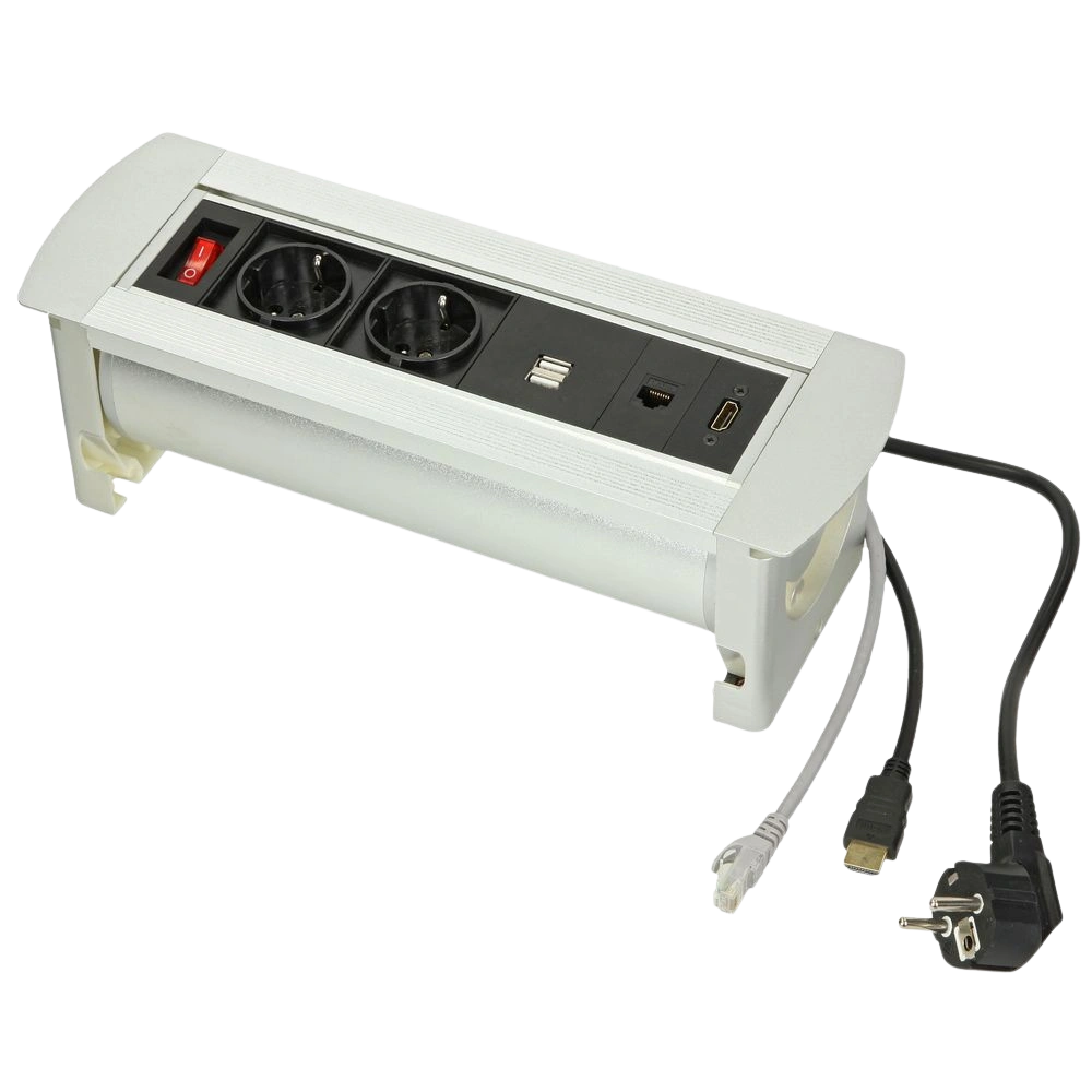 Le bloc multiprise pour une utilisation sur banc dispose de 2 prises de sécurité Schuko, une prise HDMI, une prise RJ45 et deux ports USB.